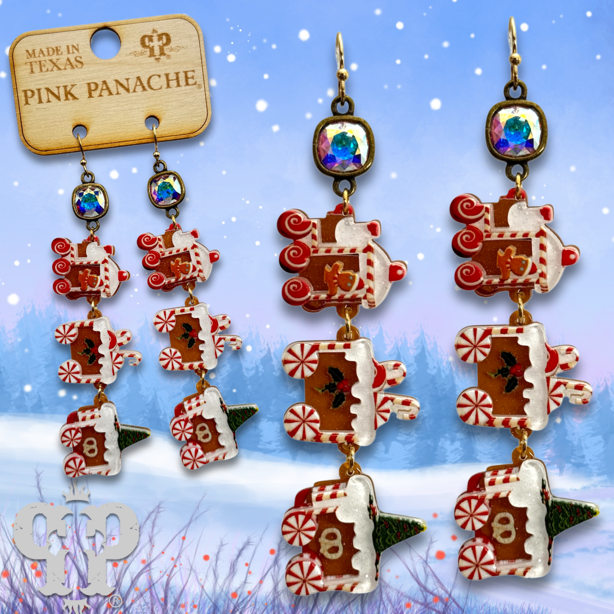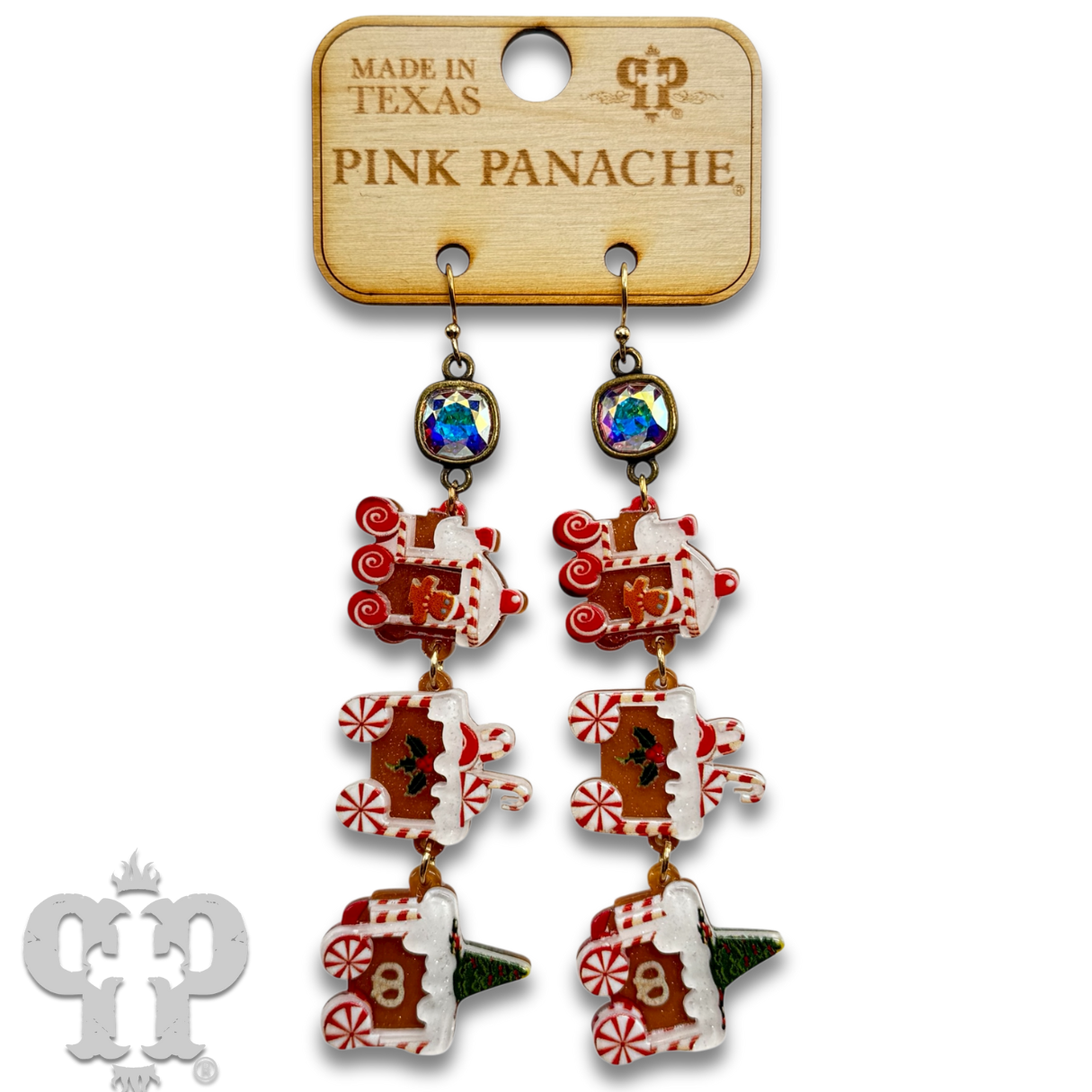 Adorable gingerbread train earrings featuring three whimsical acrylic charms accented with Austrian crystals. Perfect for adding festive charm to your holiday wardrobe or year-round fun. These lightweight, playful earrings bring a touch of nostalgia and sweetness to any outfit, making them an irresistible accessory for gingerbread lovers everywhere. It hangs from an 8mm AB Austrian crystal in a setting custom made for Pink Panache in the USA.
