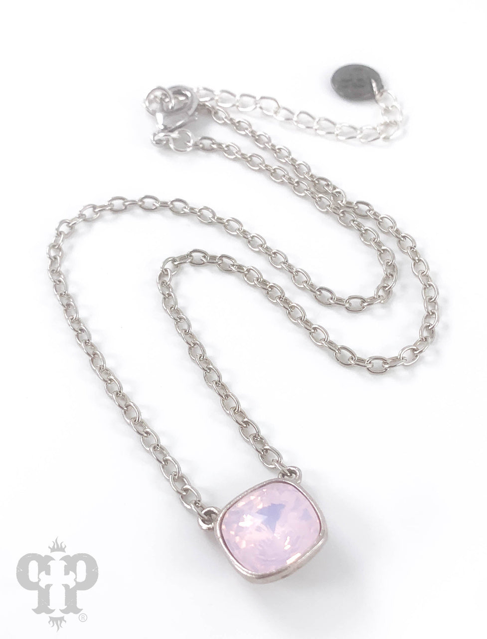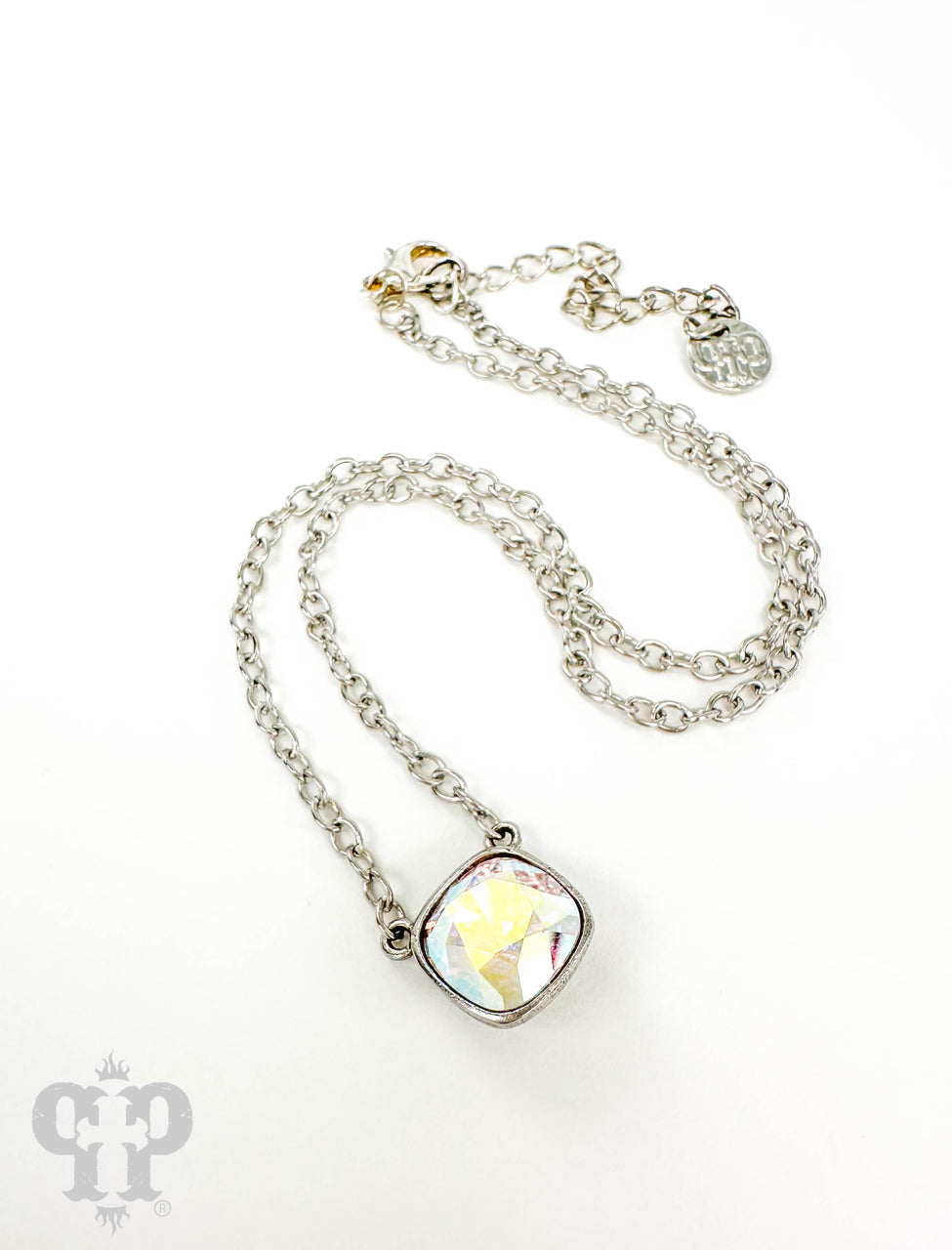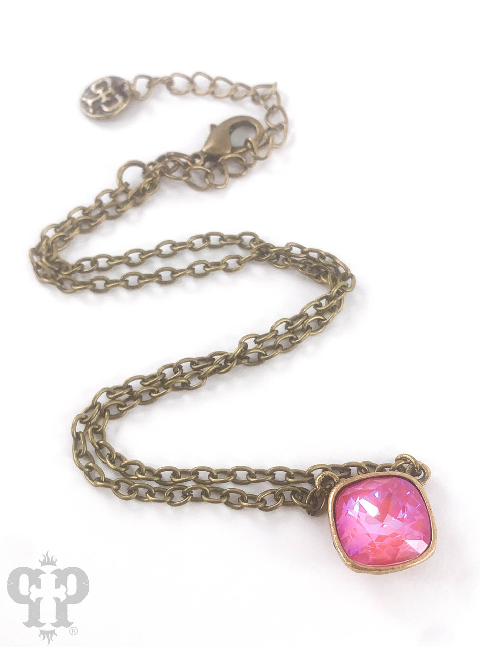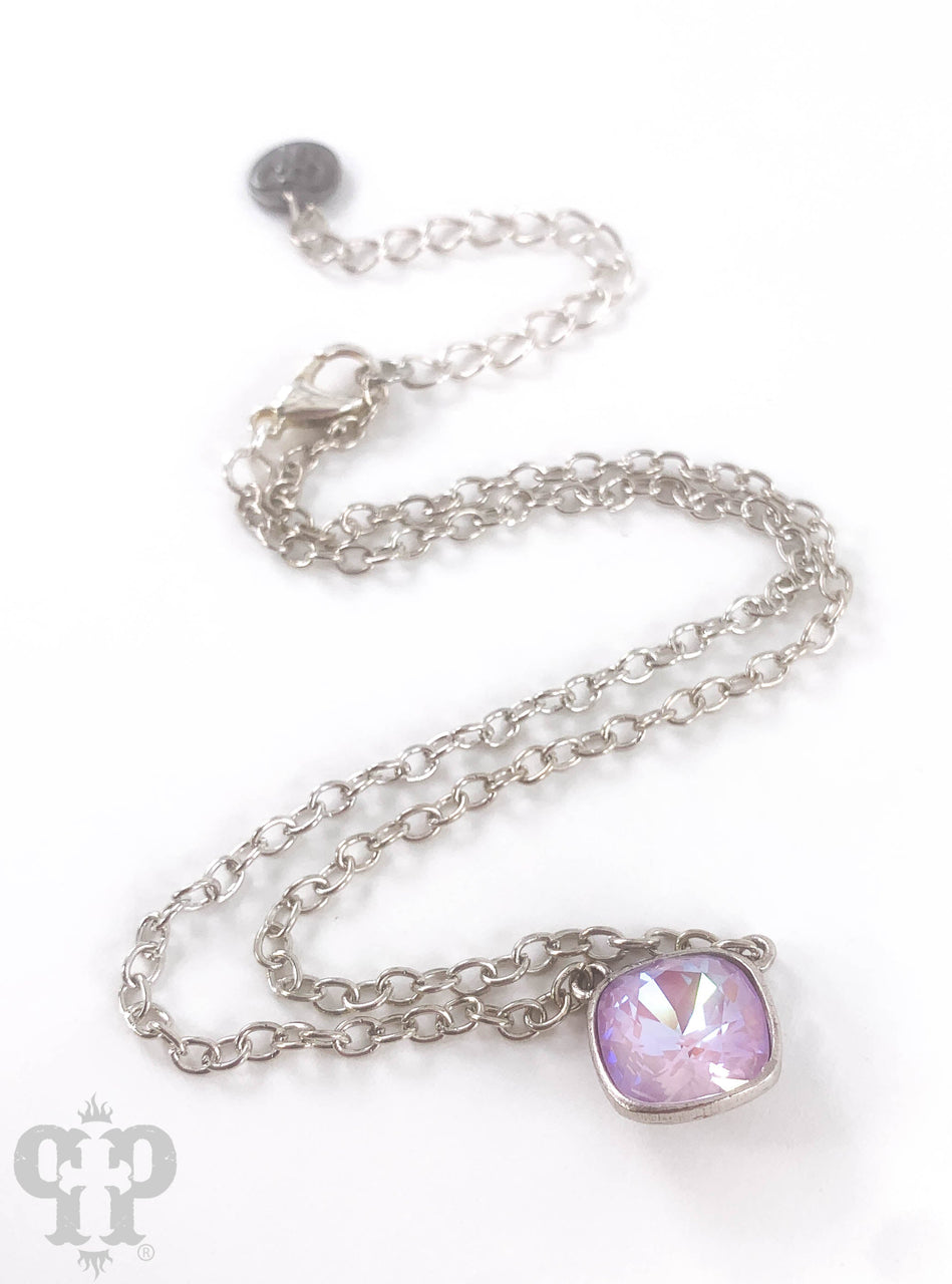 This chain necklace features a sparkling 12mm Austrian crystal stone. The stone setting is custom made for Pink Panache in the USA. The necklace is approximately 16 inches with an extender chain.