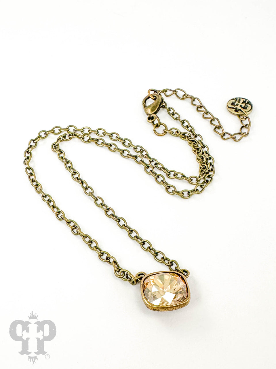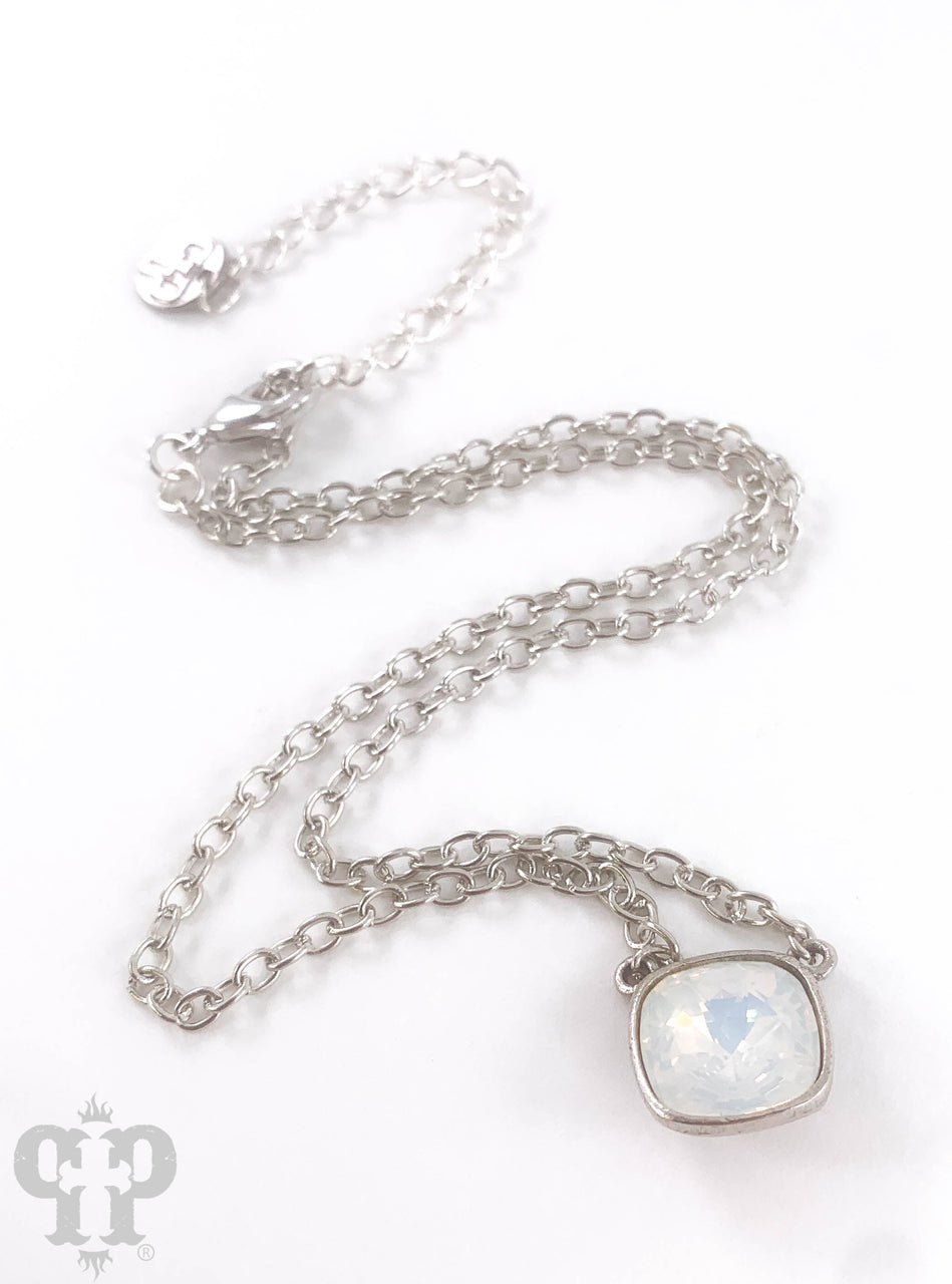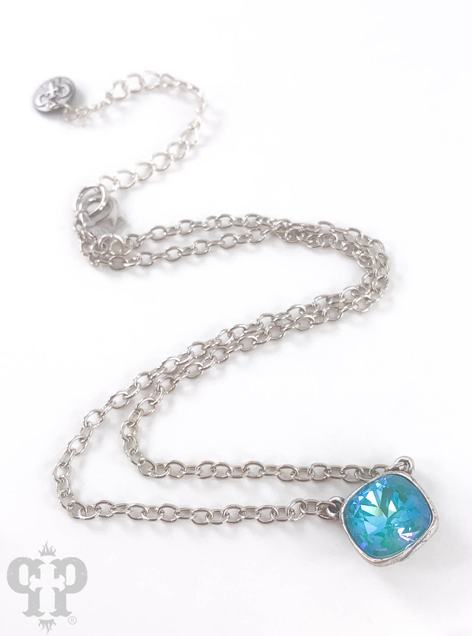 This chain necklace features a sparkling 12mm Austrian crystal stone. The stone setting is custom made for Pink Panache in the USA. The necklace is approximately 16 inches with an extender chain.