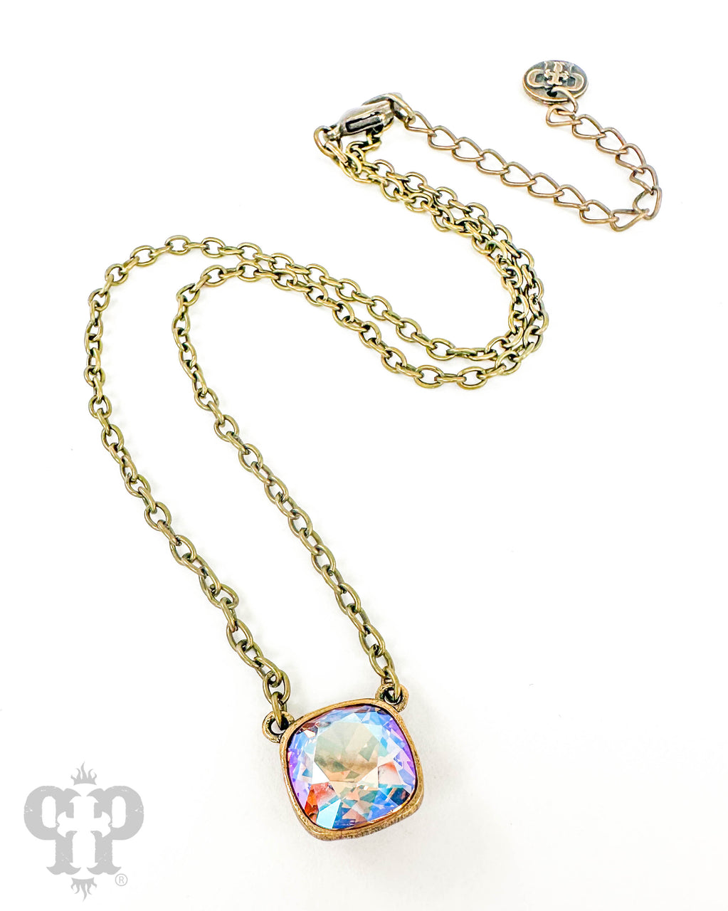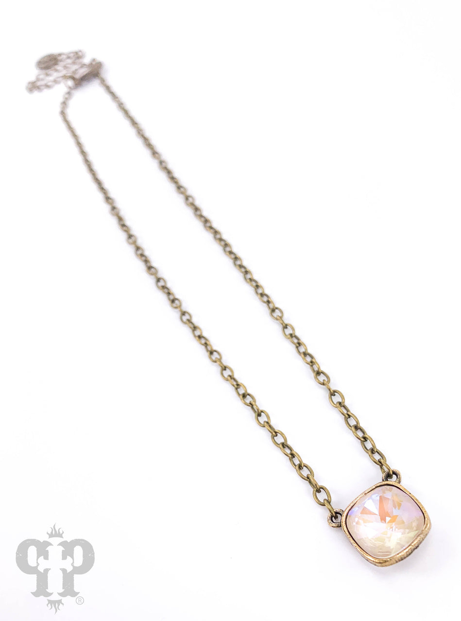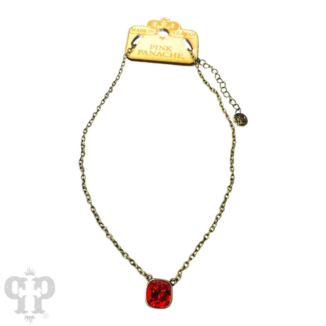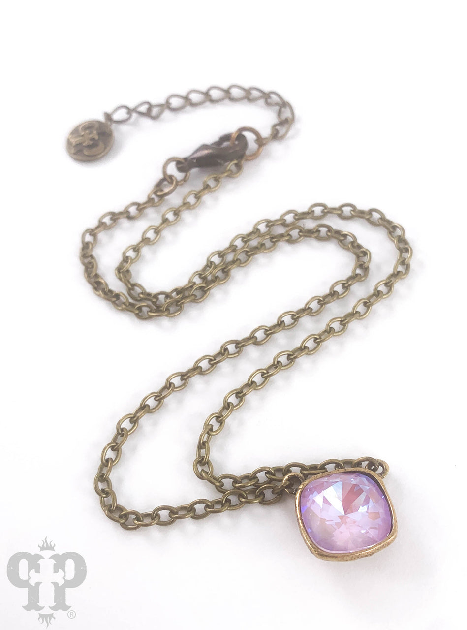 This chain necklace features a sparkling 12mm Austrian crystal stone. The stone setting is custom made for Pink Panache in the USA. The necklace is approximately 16 inches with an extender chain.