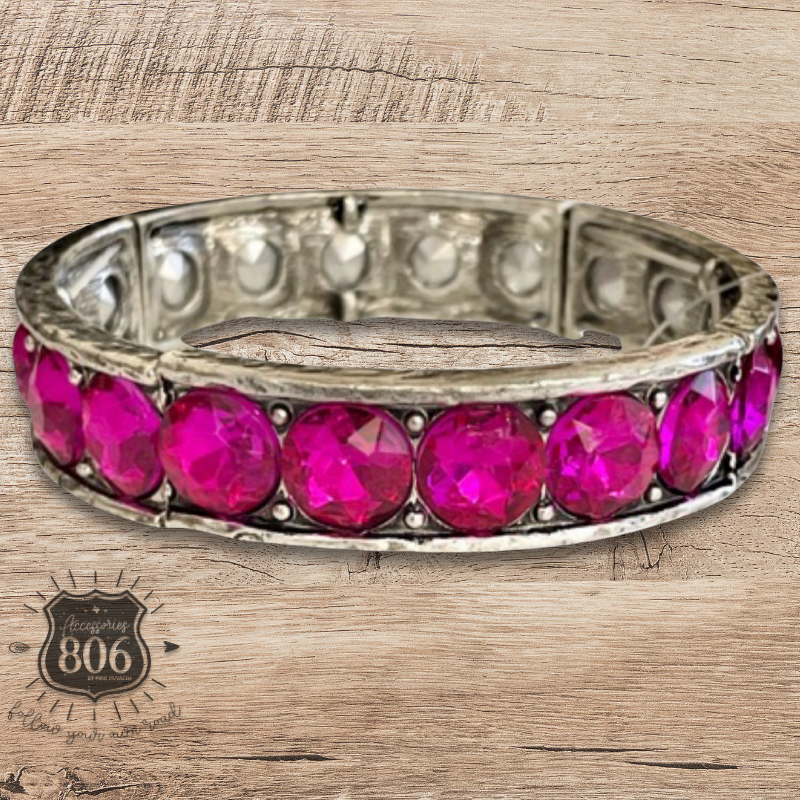 This stretch bracelet has a bangle look and features round set in sparkling rhinestones.