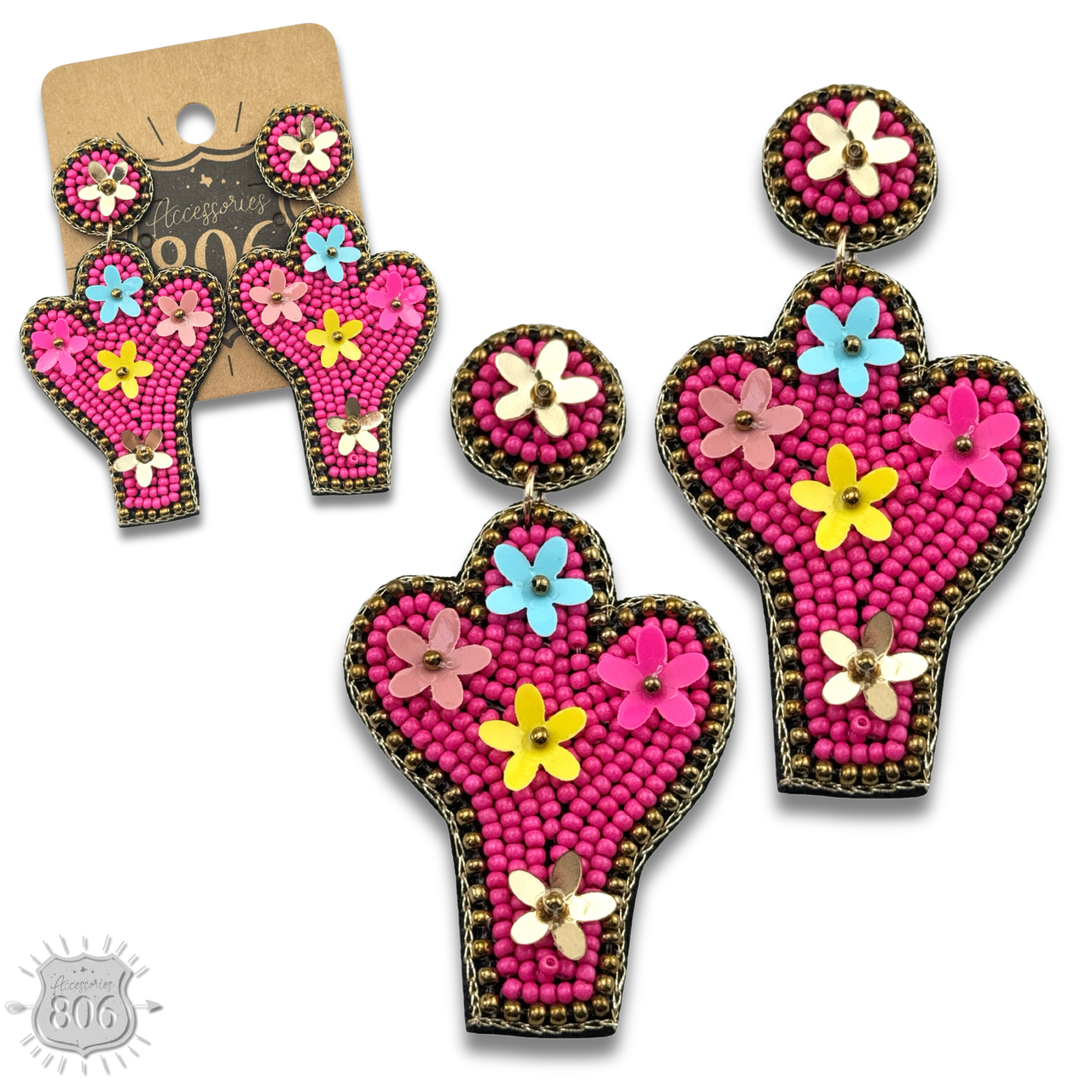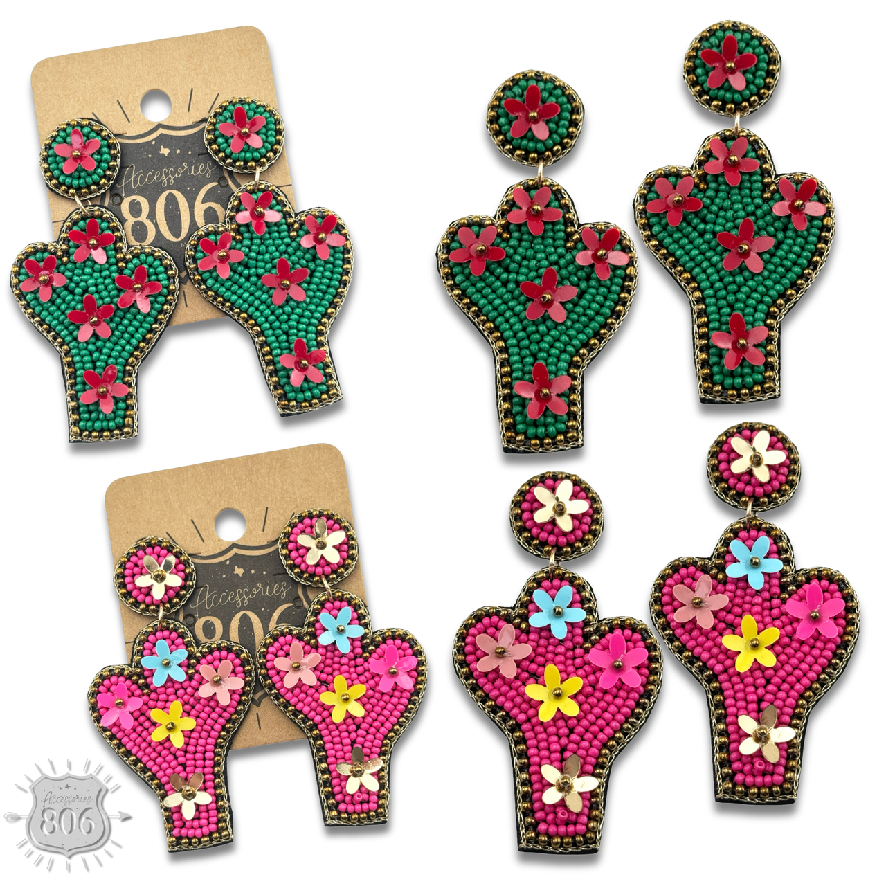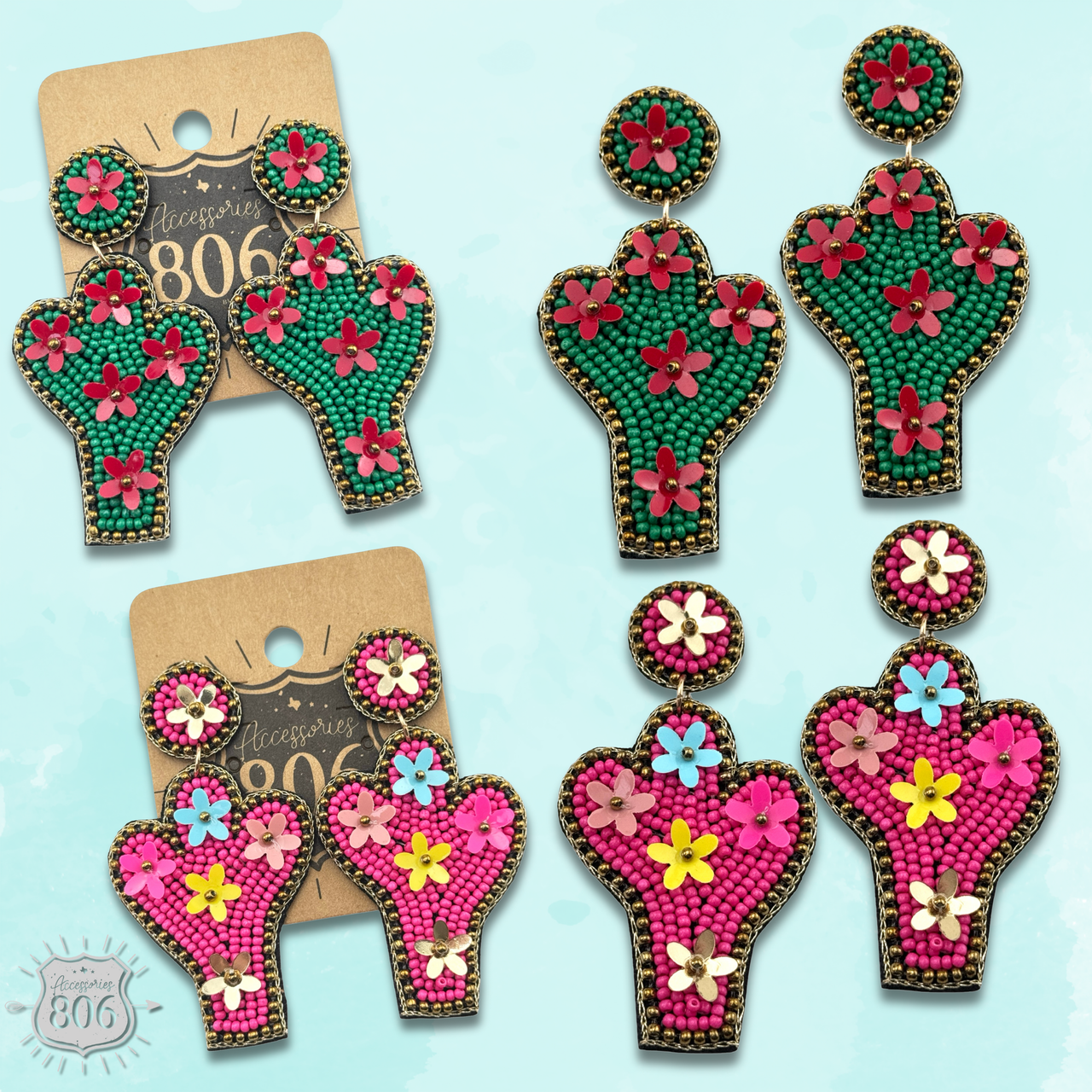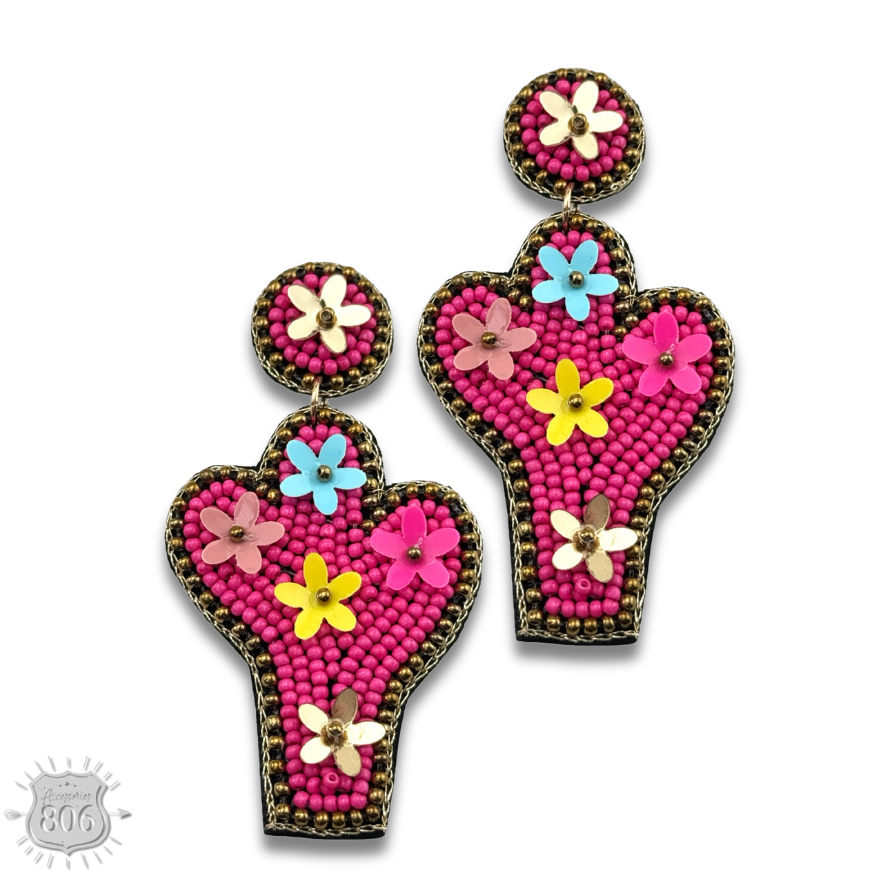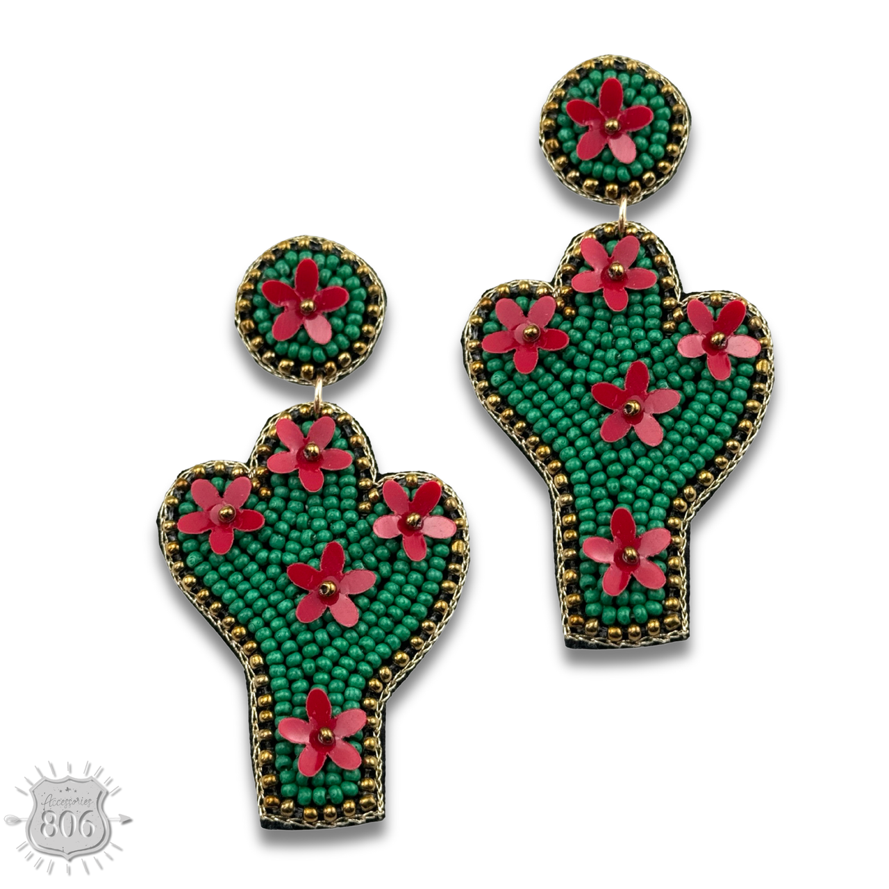 This cactus earring is adorned with tiny gold seed beads and flower embellishments.