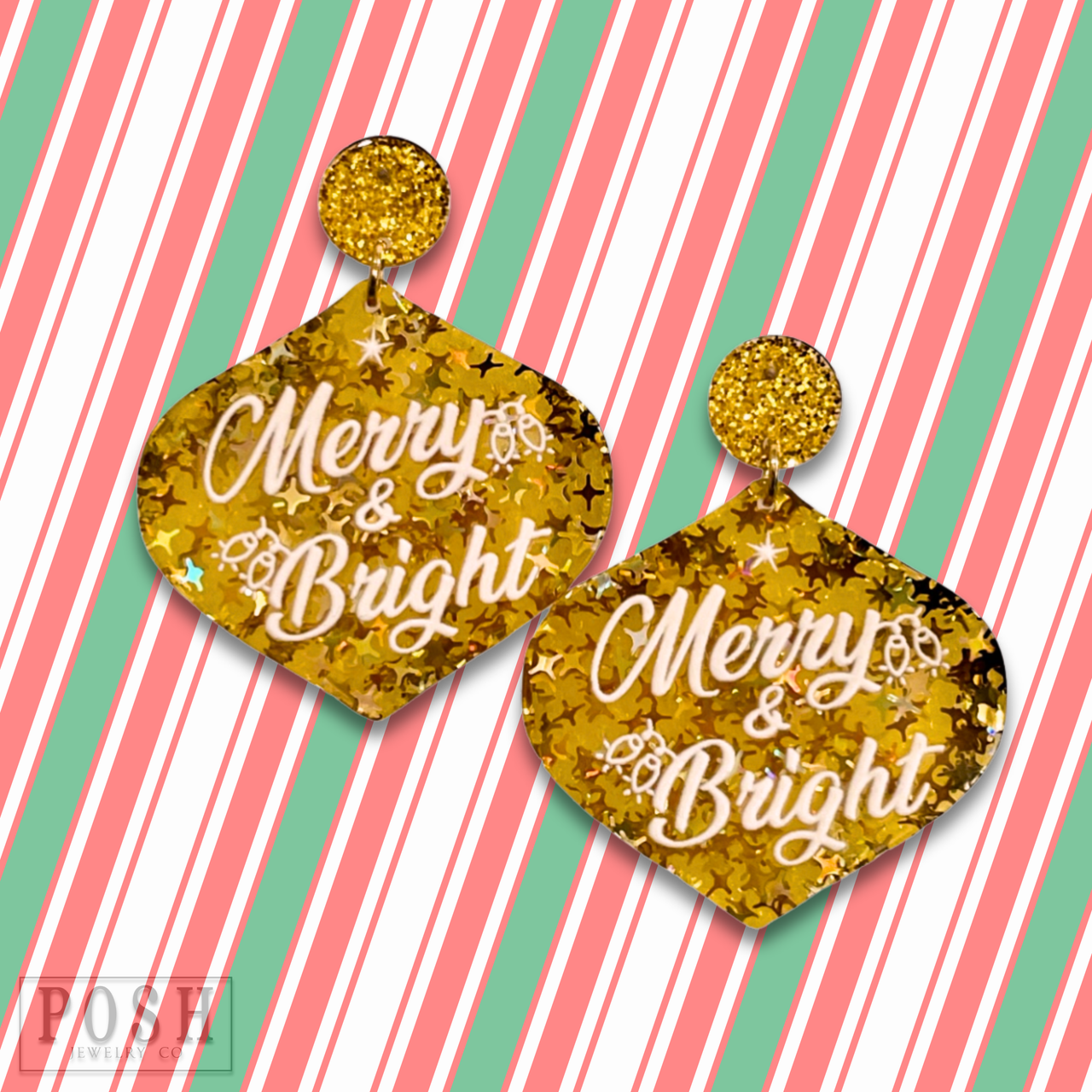 This Christmas ornament shape earring is acrylic and says Merry & Bright.