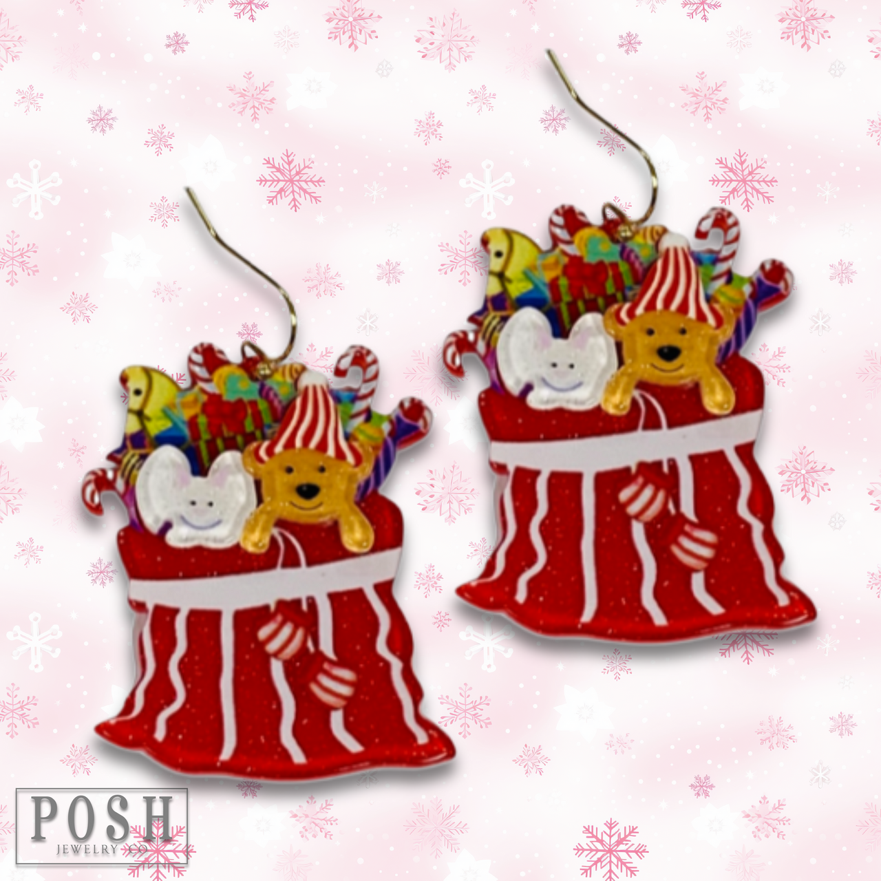 These candy-cane-colored gift bag earrings make a festive addition to Christmas.