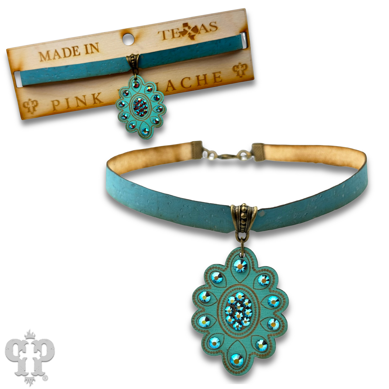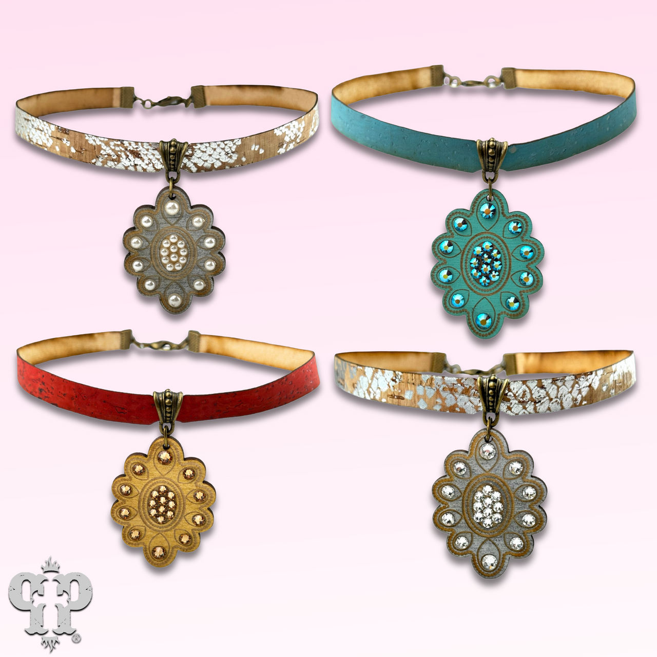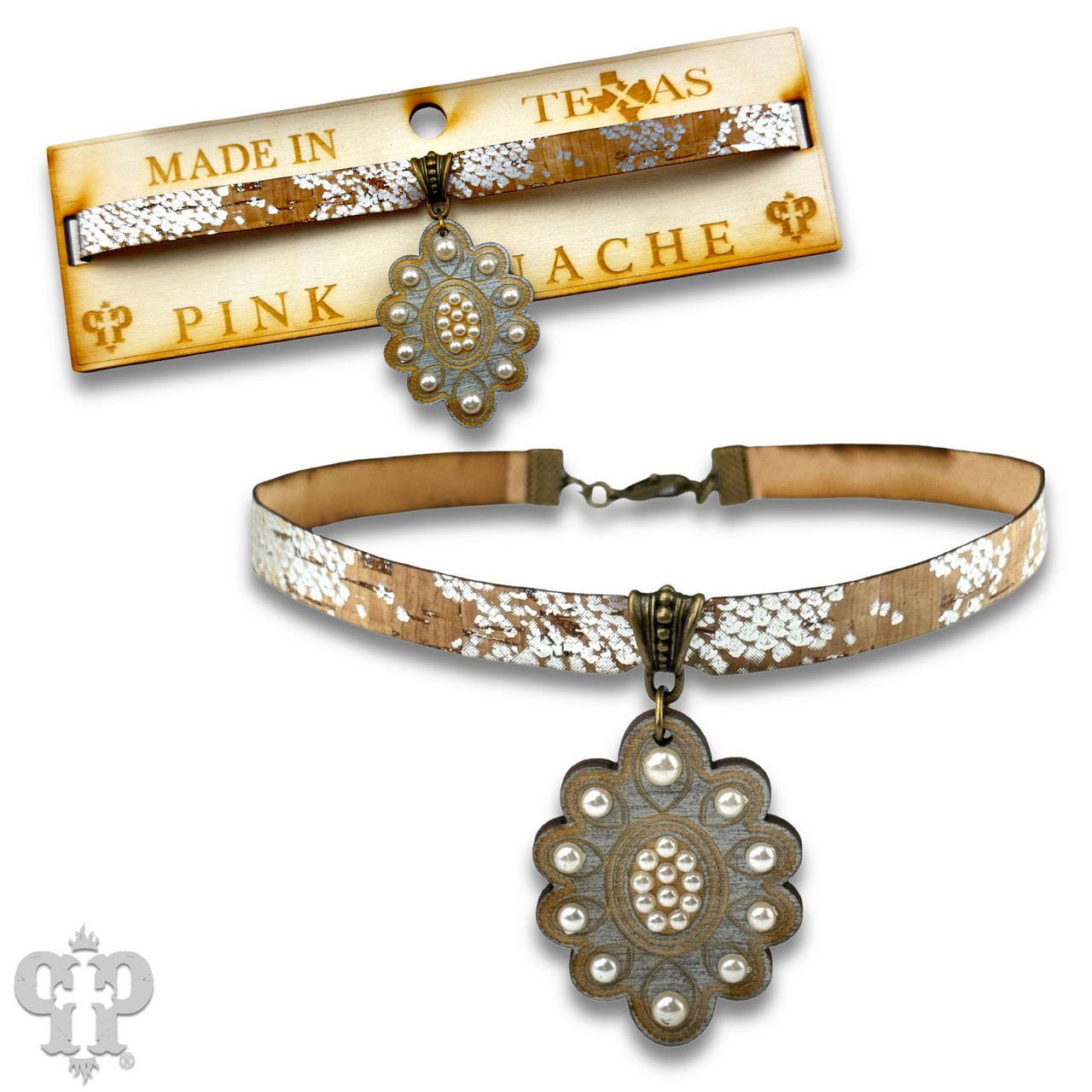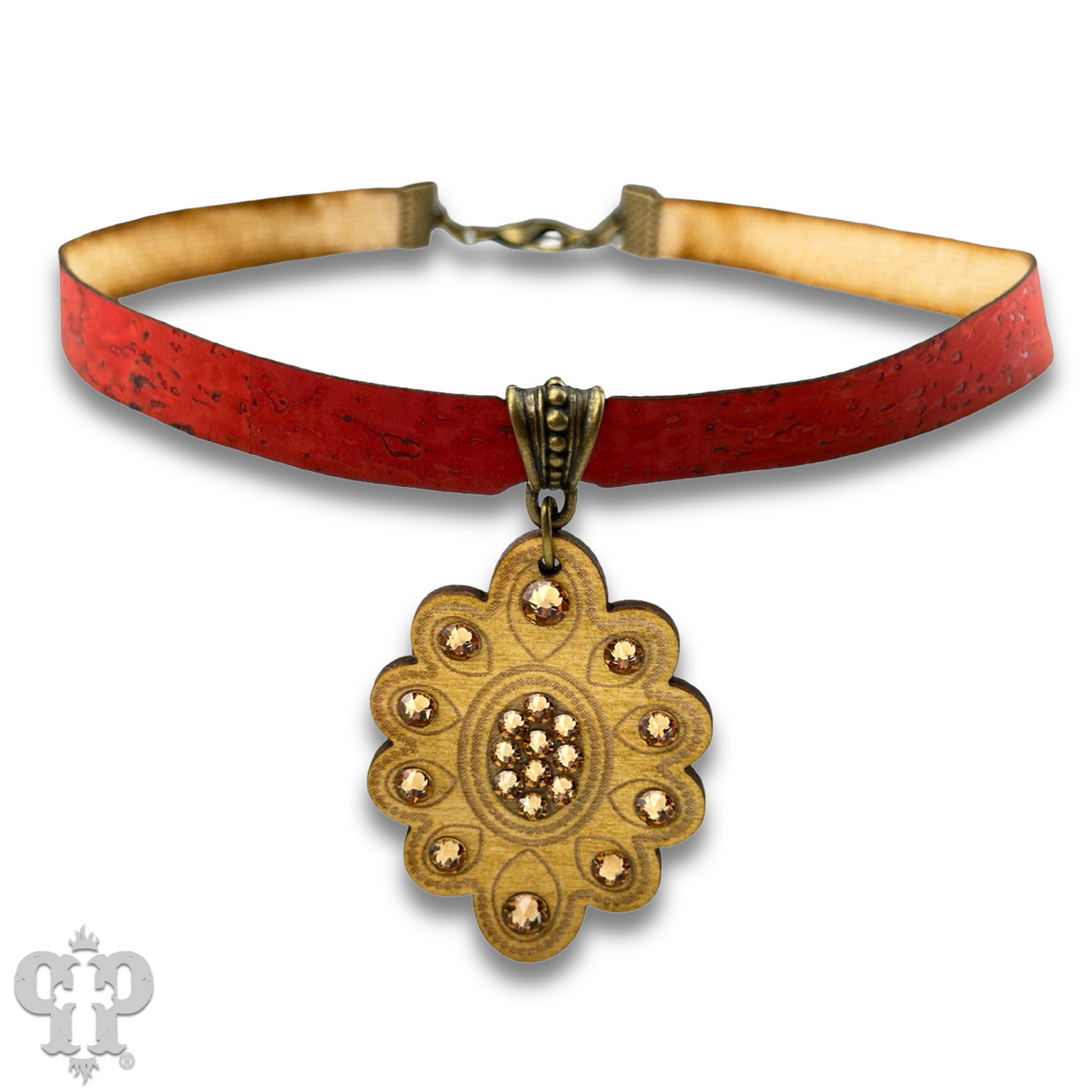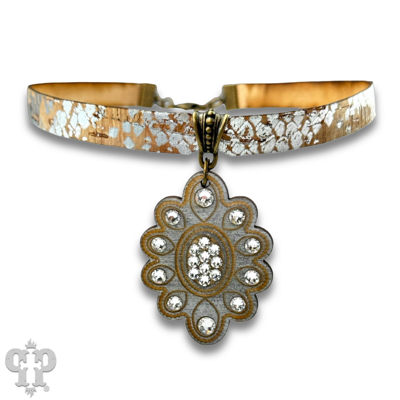 This necklace has a scalloped wood charm with handset Austrian crystals.  It is on a laser cut cork fabric choker.