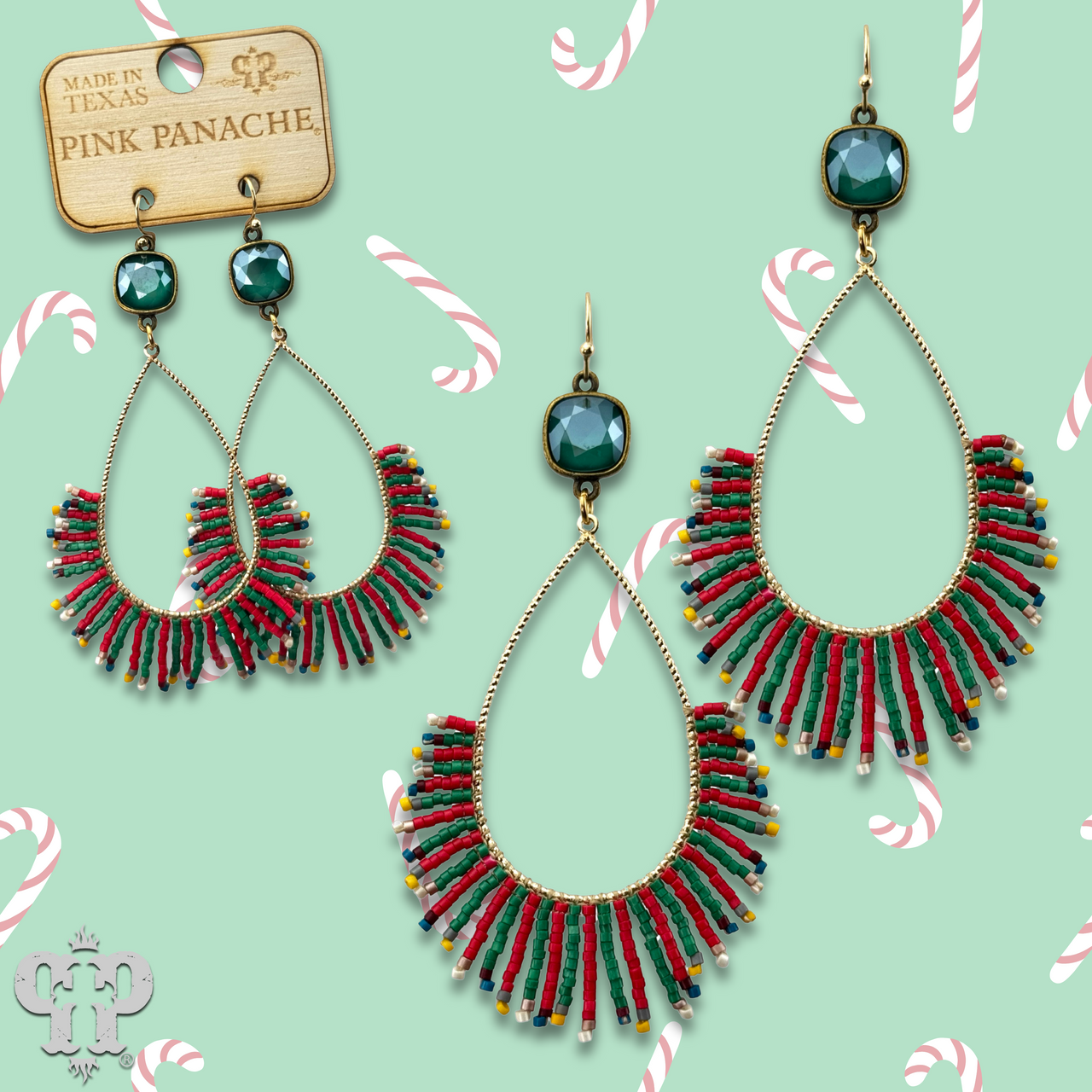 This earring has a gold tone teardrop with red and green bead fringe along the bottom. It hangs from a 10mm royal green Austrian crystal in a setting custom made for Pink Panache in the USA.
