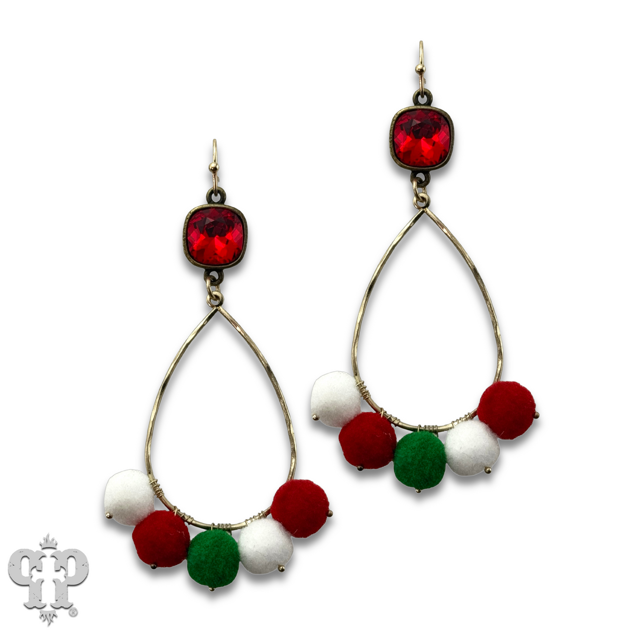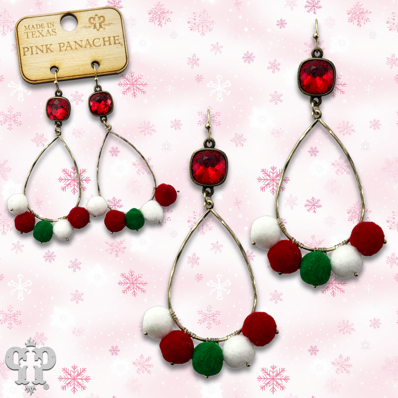This earring has a gold tone teardrop with green, red and white pom-poms. It hangs from an 10mm light siam (red) Austrian crystal in a setting custom made for Pink Panache in the USA.