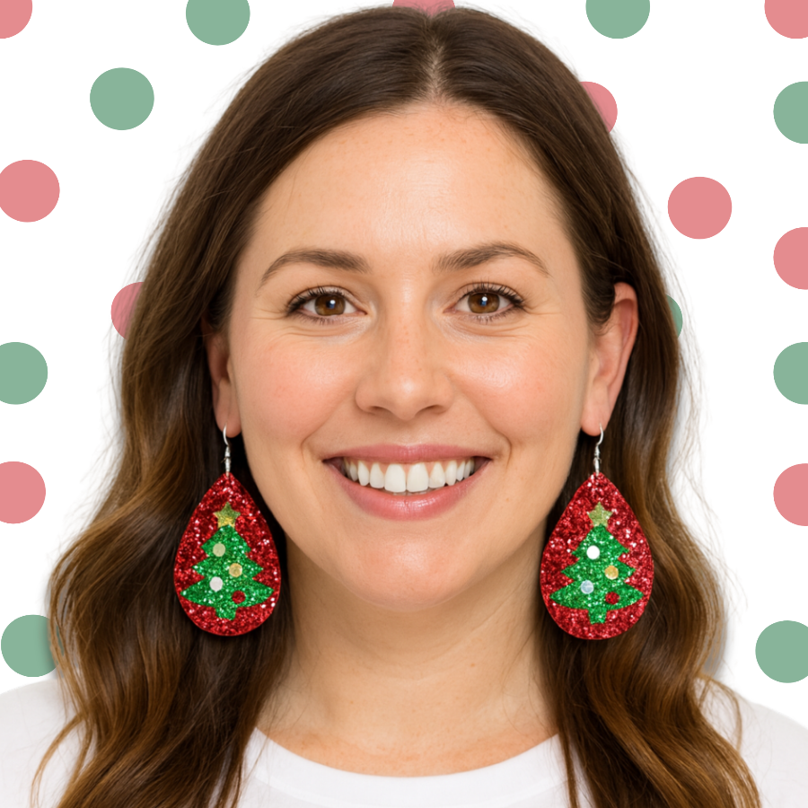 These sequin teardrop earrings feature a Christmas tree in the center.  The earrings hang from a french hook.