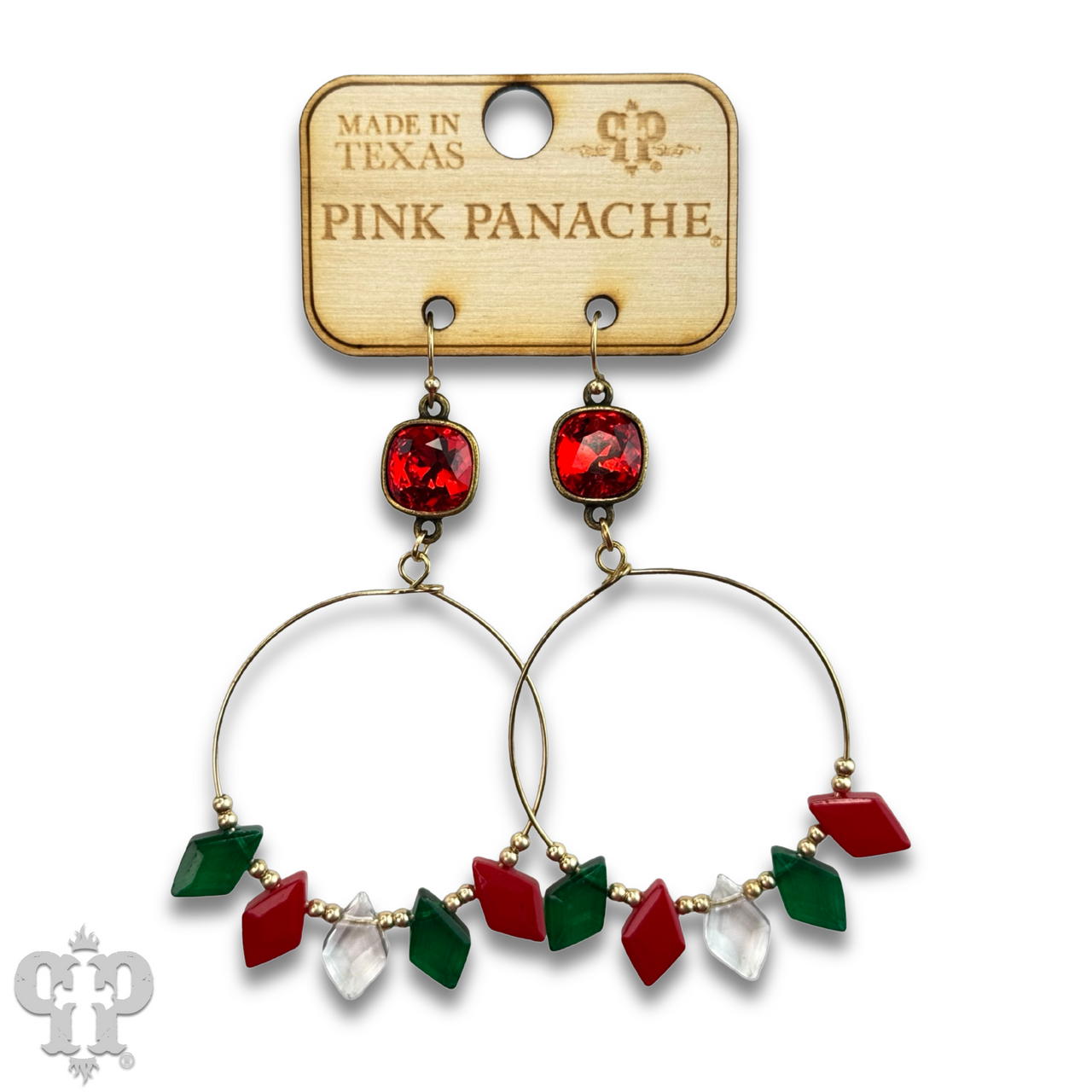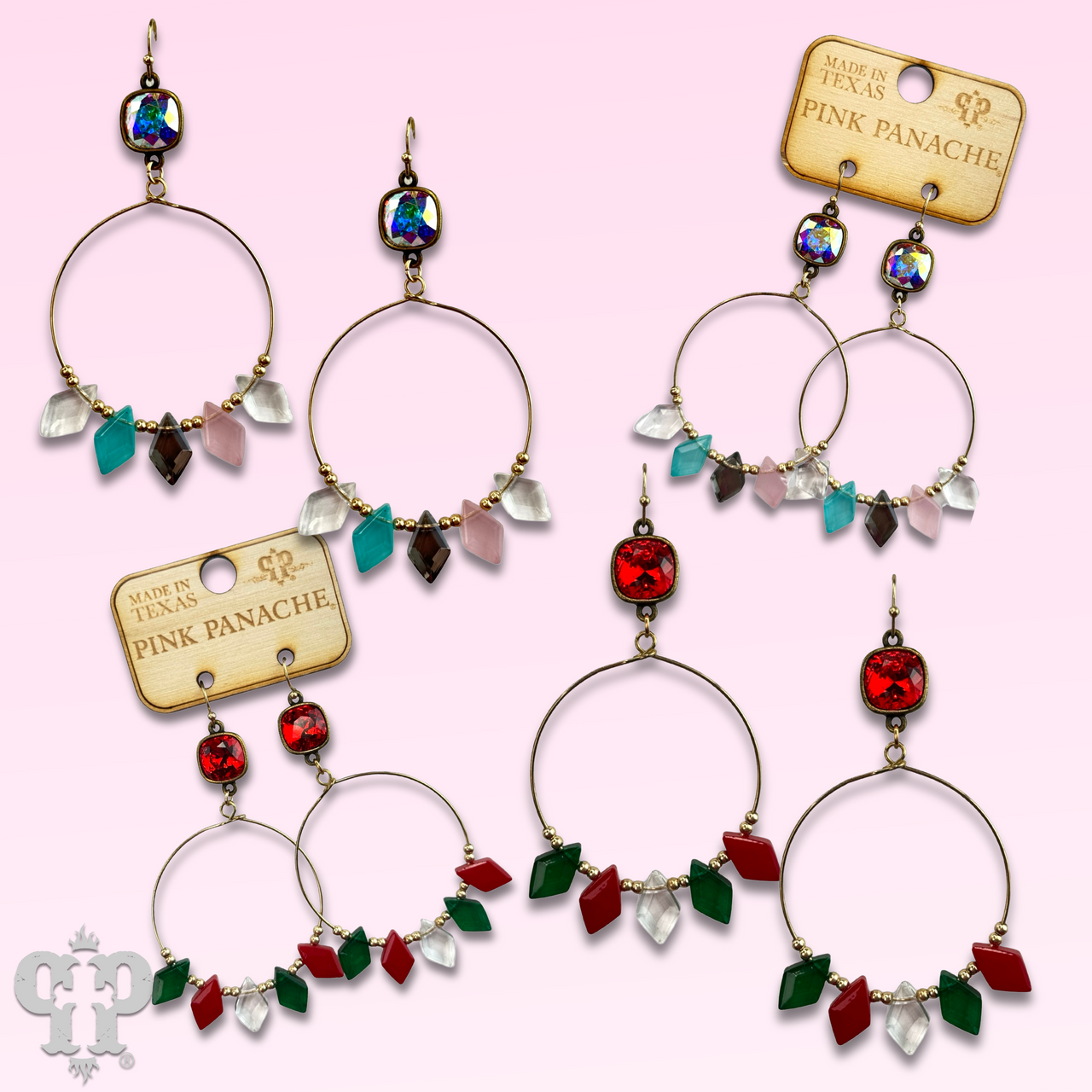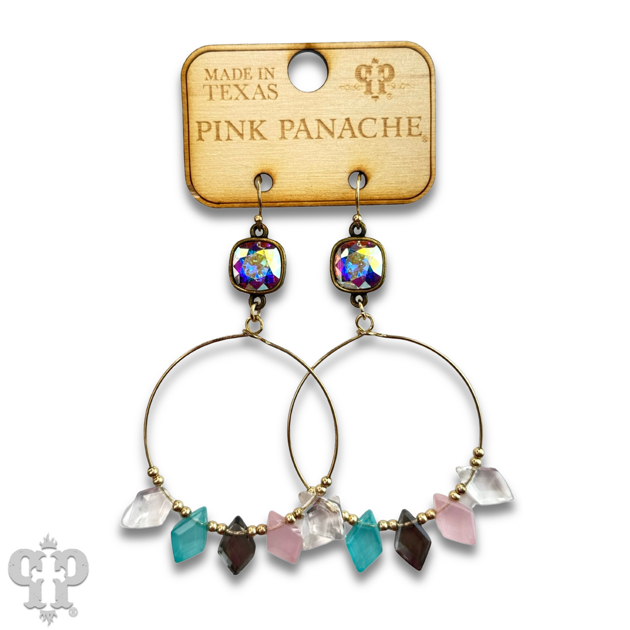 These earrings have playful diamond shape beads along the bottom of a circle. They hang from an Austrian crystal.