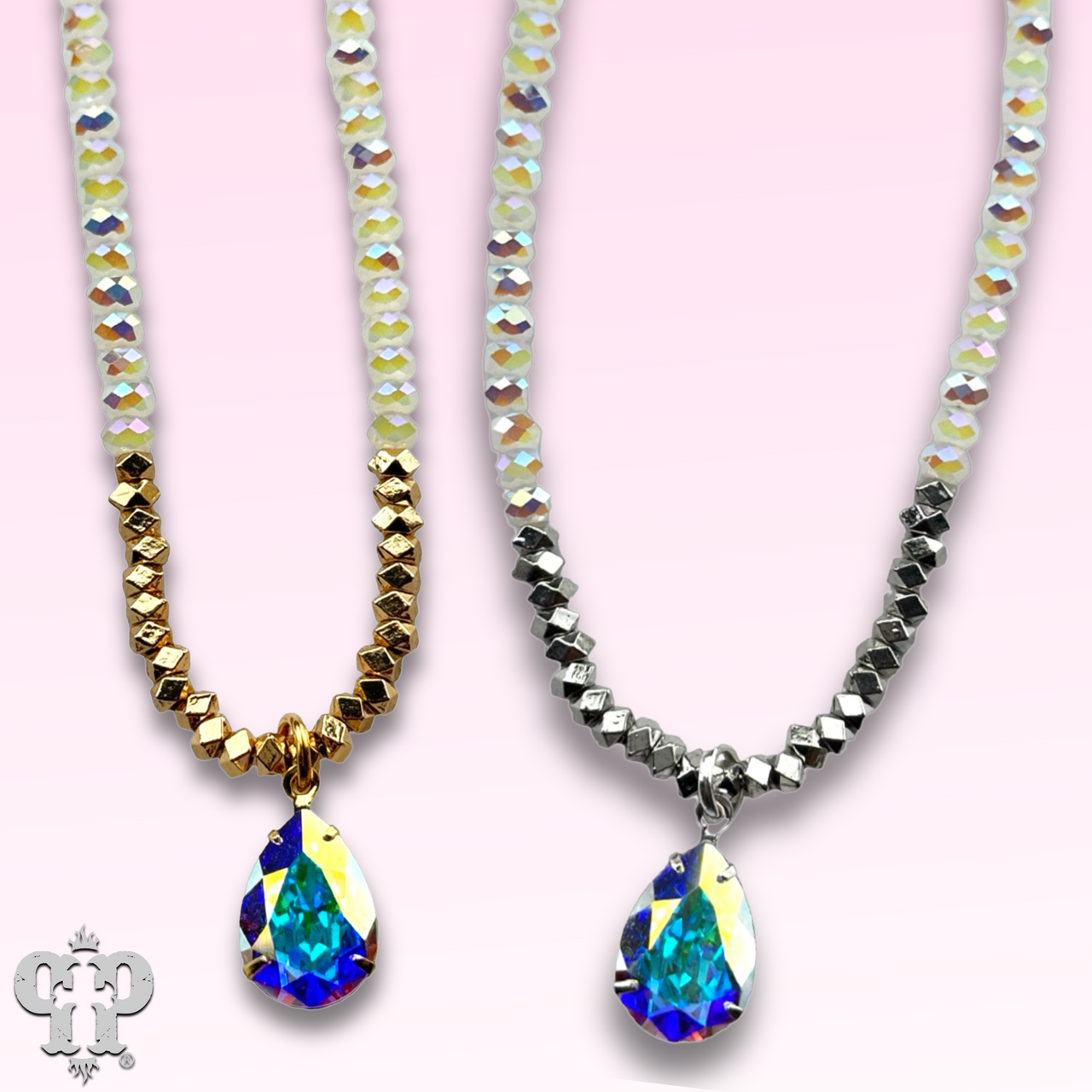 This necklace has faceted, white iridescent beads.  The pendant is an Austrian crystal teardrop in a setting custom made for Pink Panache in the USA.