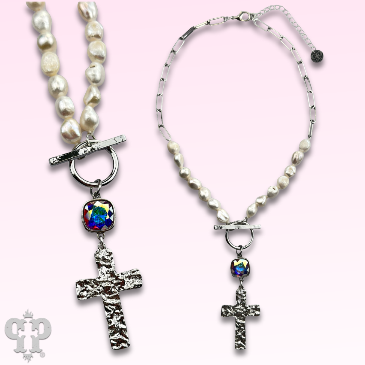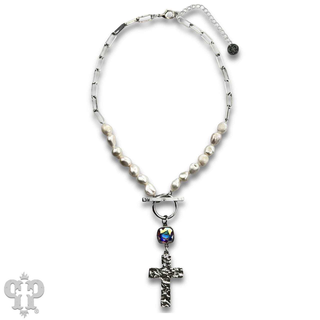 This necklace has freshwater pearls and paperclip chain with a toggle closure in the front. It features a 12mm iridescent (AB) crystal in a setting custom made for Pink Panache in the USA along with a square foil cross charm.