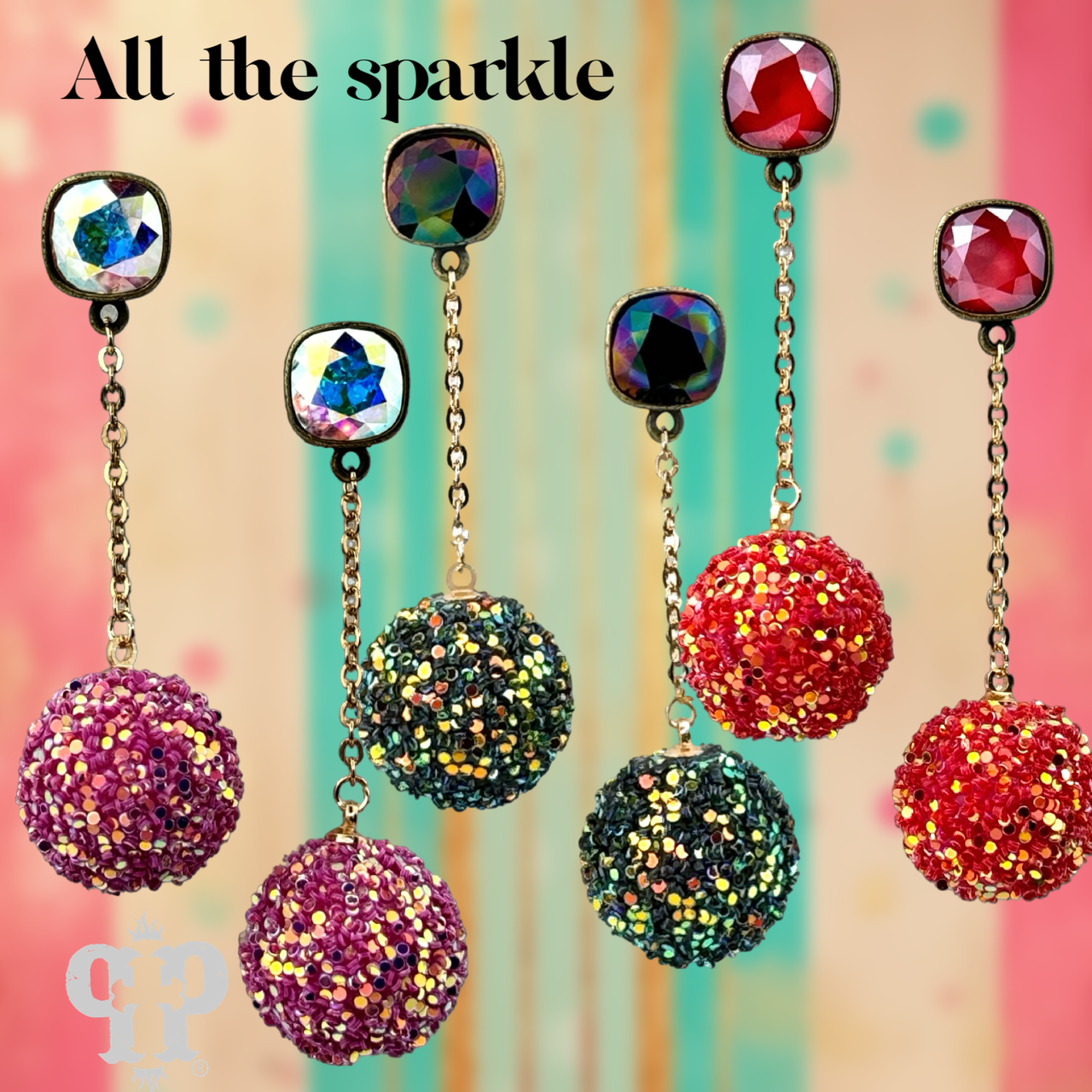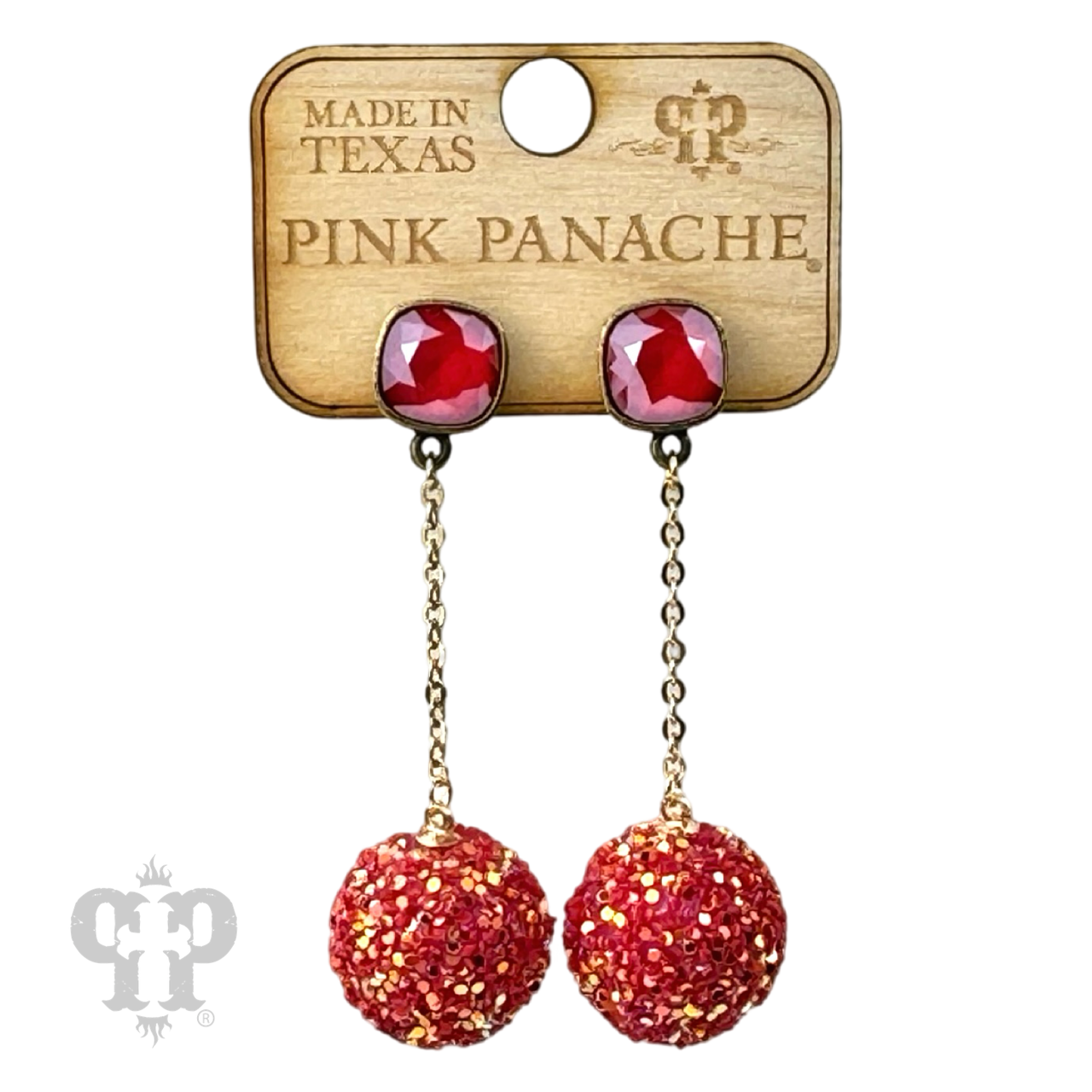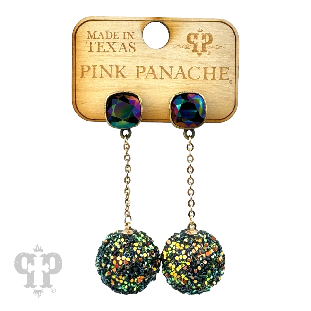 This flashy glitter round bead hangs from a delicate gold tone chain that is connected to a 10mm Austrian crystal. The post back setting is custom made for Pink Panache in the USA.
