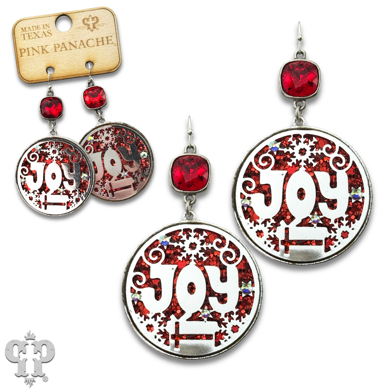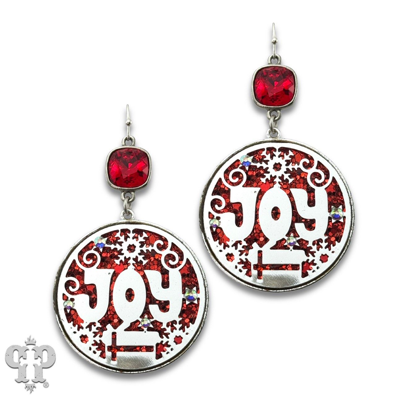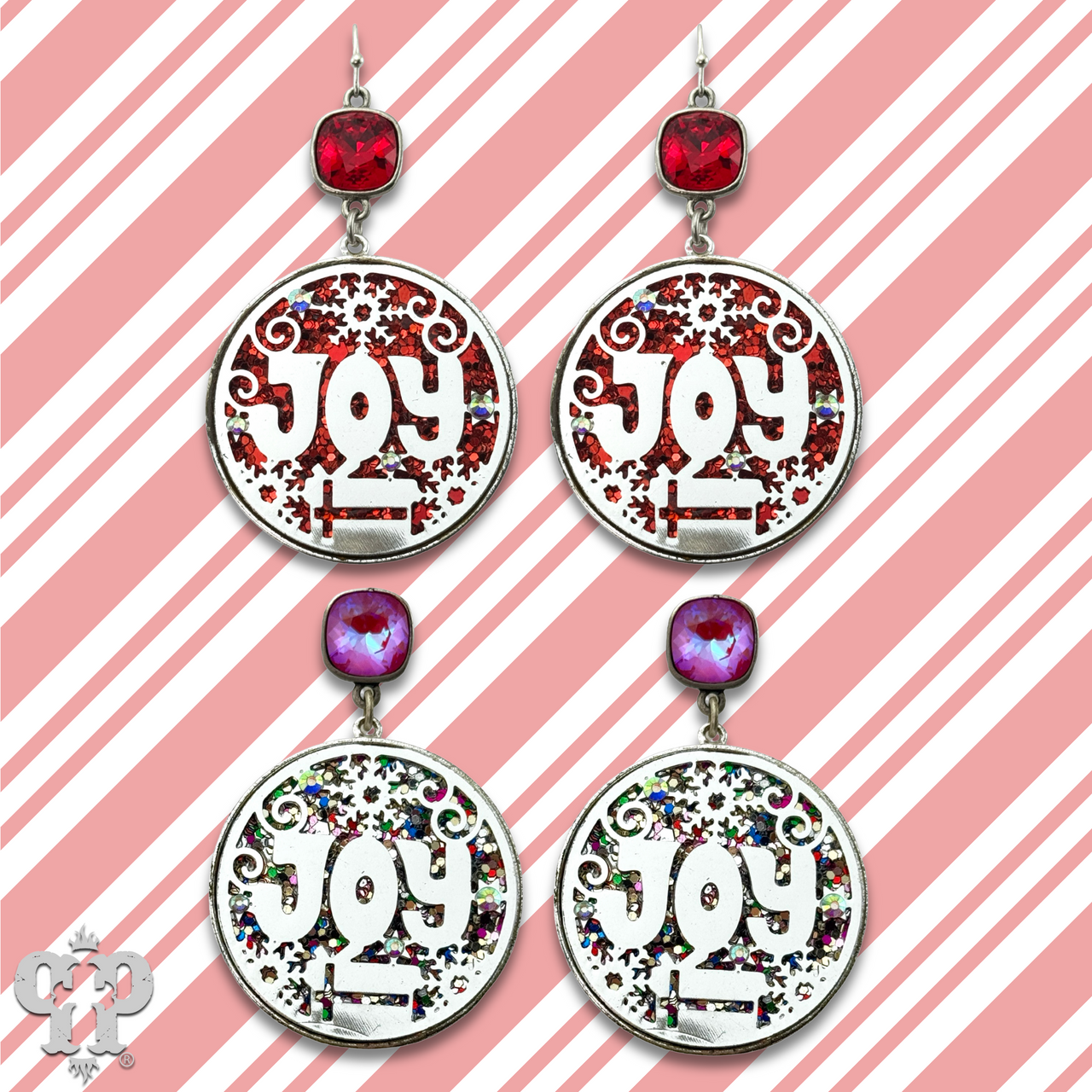 This earring has a laser overlay spelling out JOY with a glitter background. It hangs from an Austrian crystal in a setting custom made for Pink Panache in the USA.