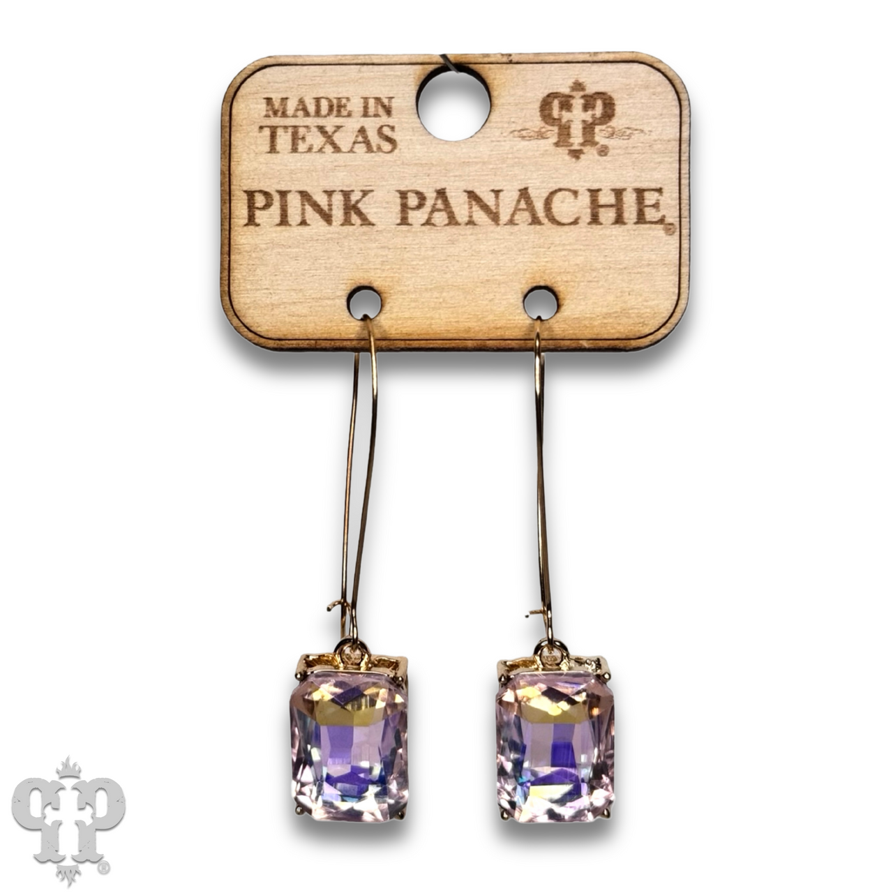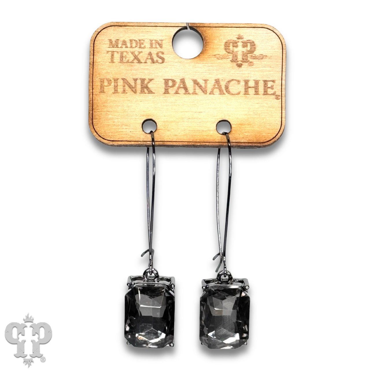 This earring has a sparkling rectangle rhinestone in a prong and kidney wire setting.