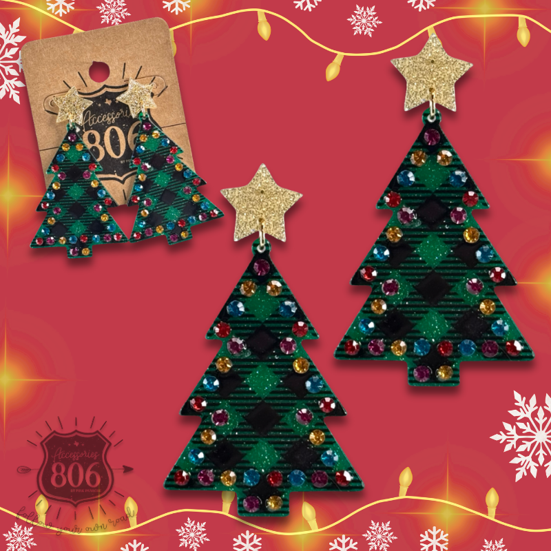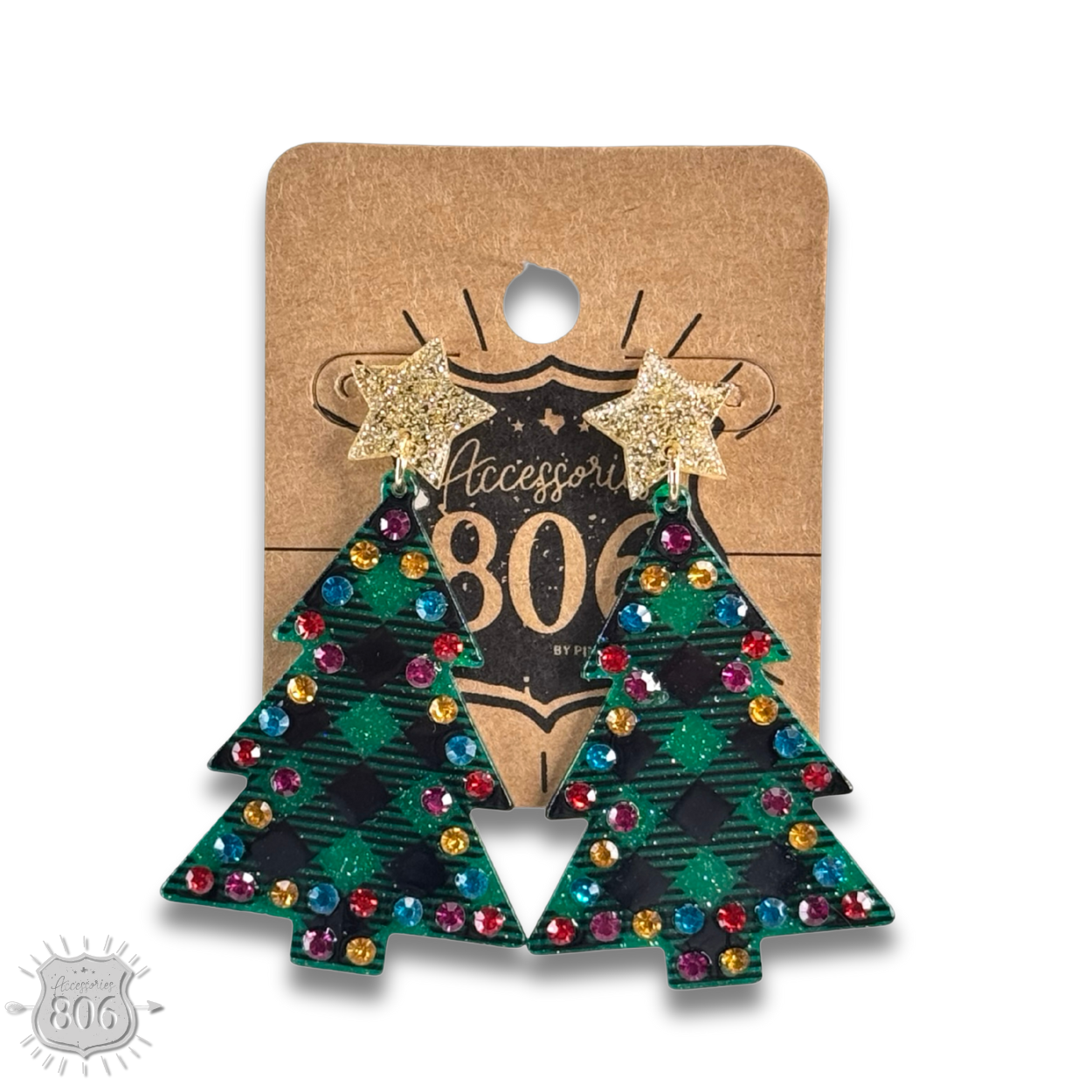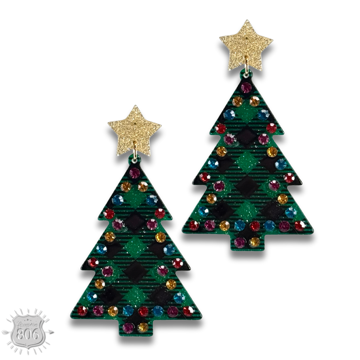 These acrylic Christmas tree shape earrings have a plaid pattern with rhinestones around the edges to look like lights. They are on an acrylic star post setting.