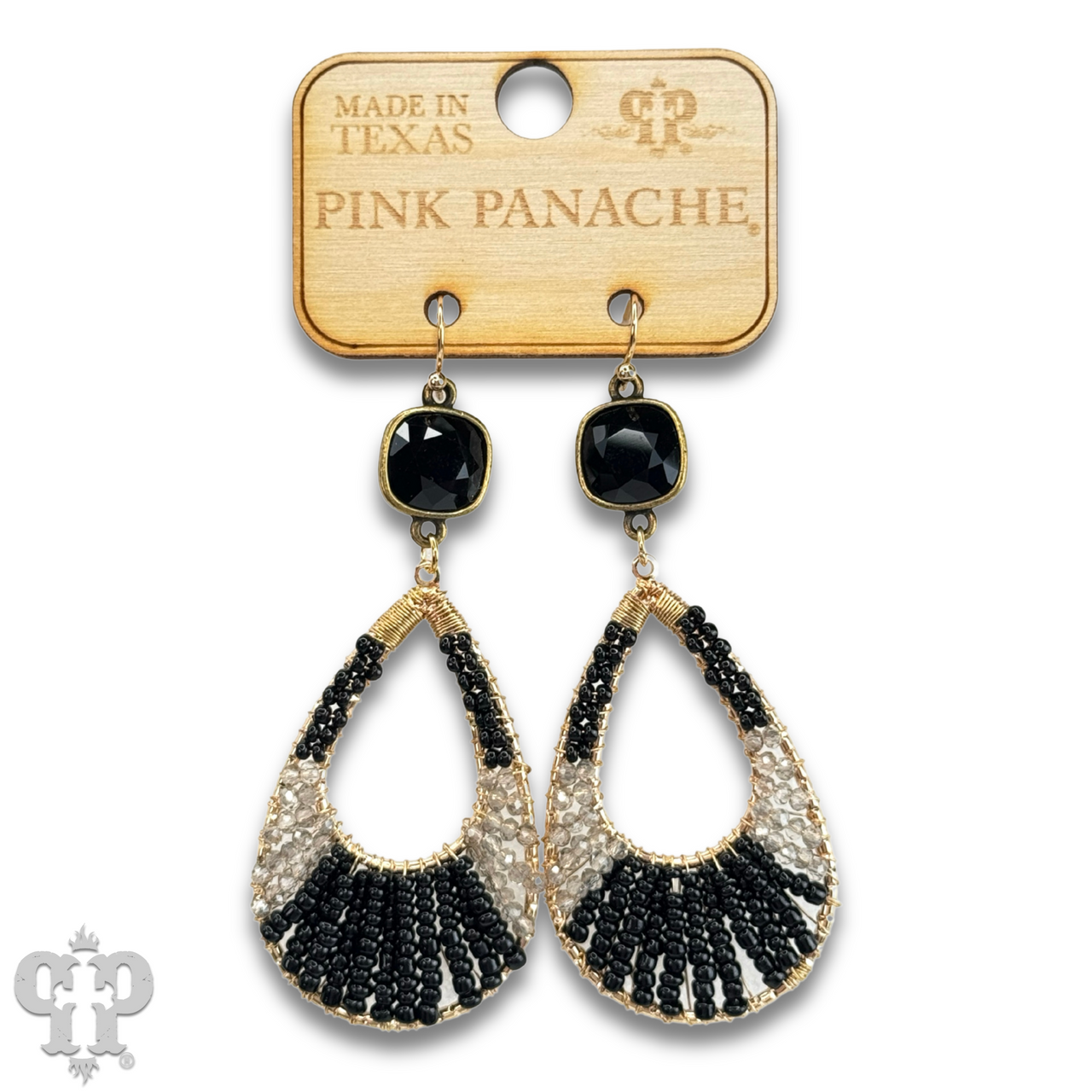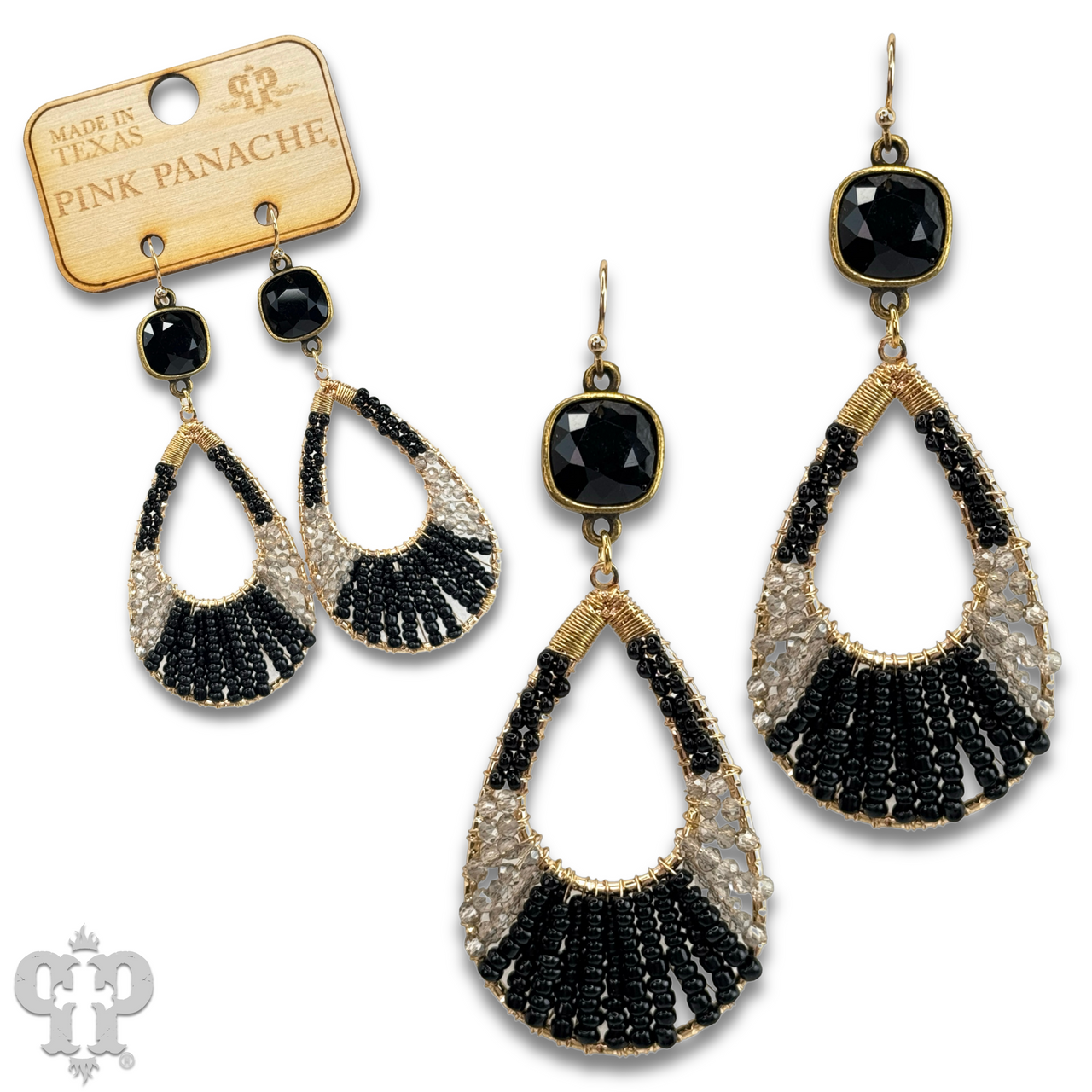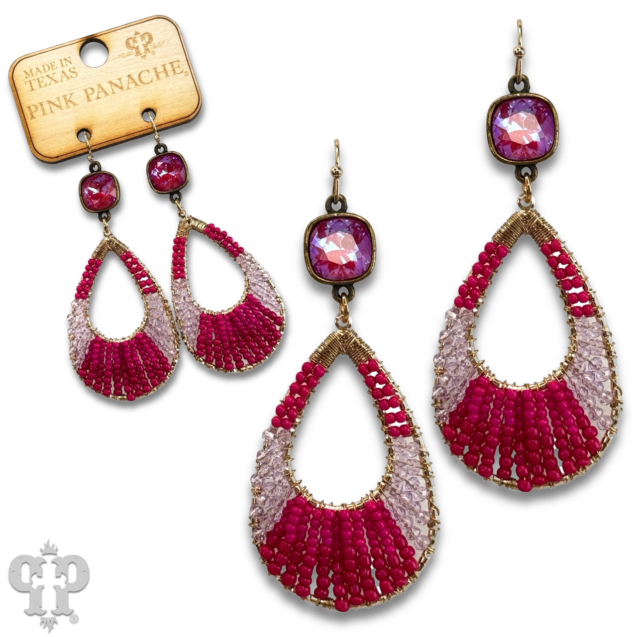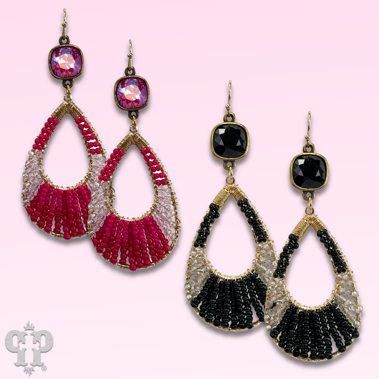 This earring has tiny seed beads wrapped onto a teardrop shape earring. They hang from an Austrian crystal.