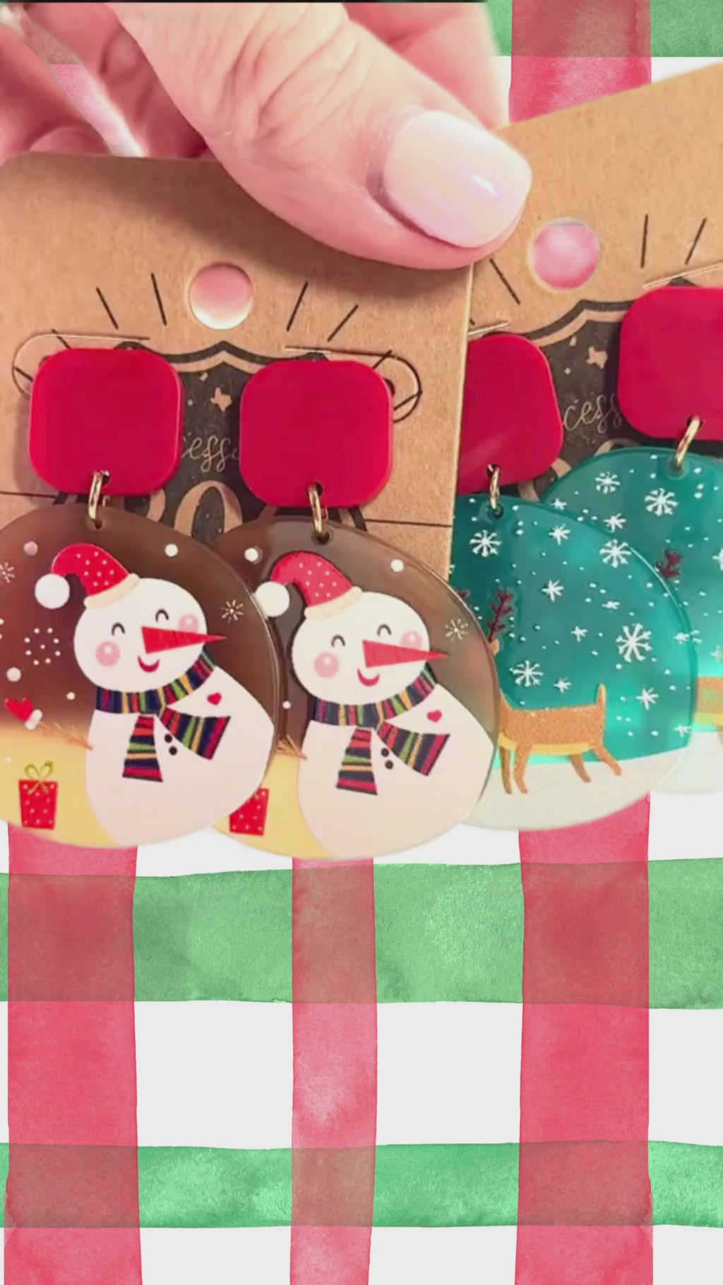 These acrylic earrings have a fun Christmas winter scene in both color options. They hang from a square red acrylic post setting.