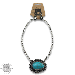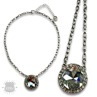 Western oval rhinestone pendant on burnished silver bead necklace