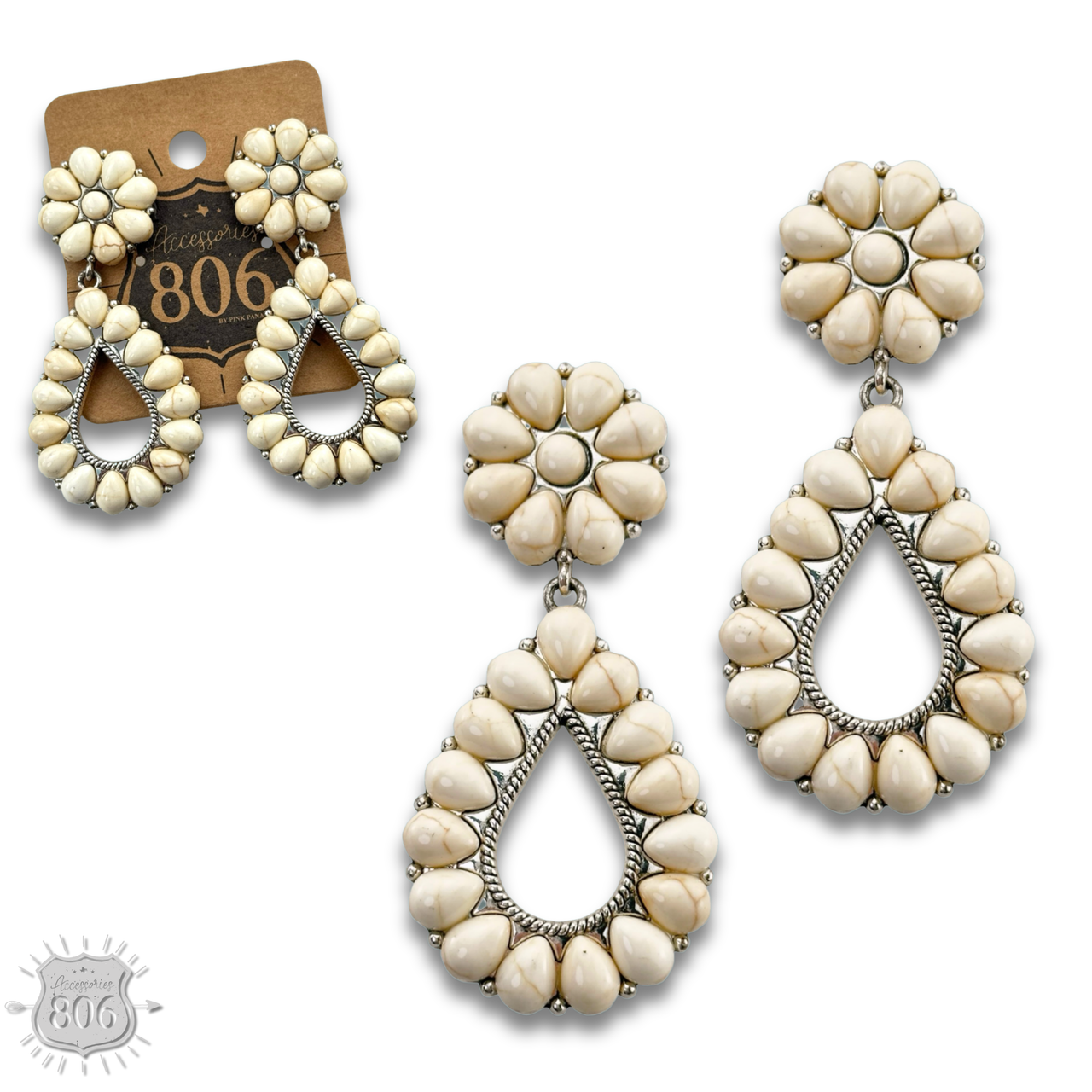 This earring features white set in stones in a teardrop shape and hangs from a stone flower post setting.