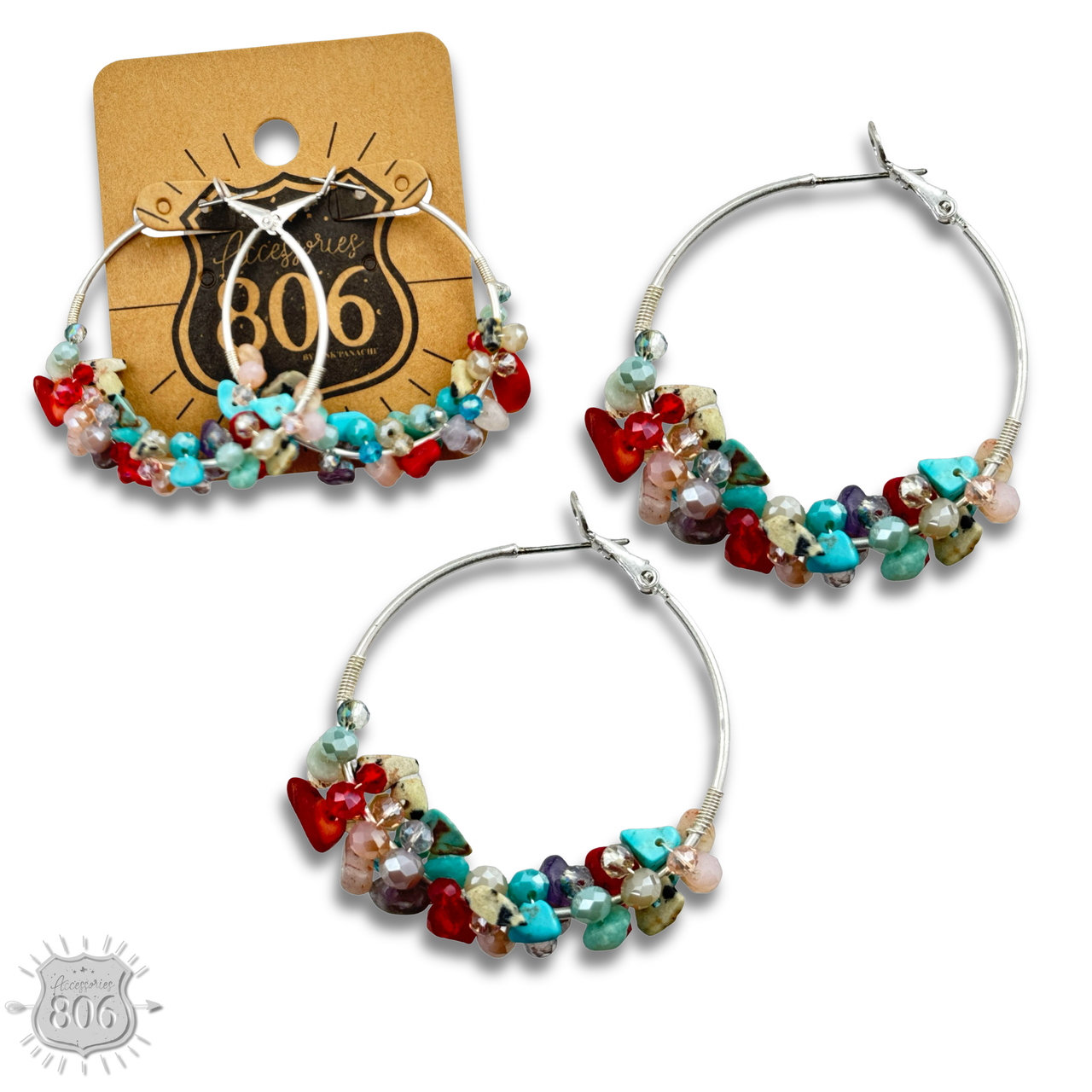 These silver tone hoop earrings have a mix of stone chip beads, giving them a playful look.