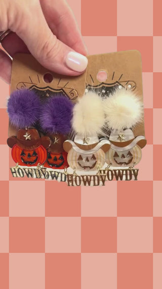 These fun Howdy pumpkin earrings feature little pumpkins with a glitter cowboy hat and hangs from a fuzzy pom-pom post setting.
