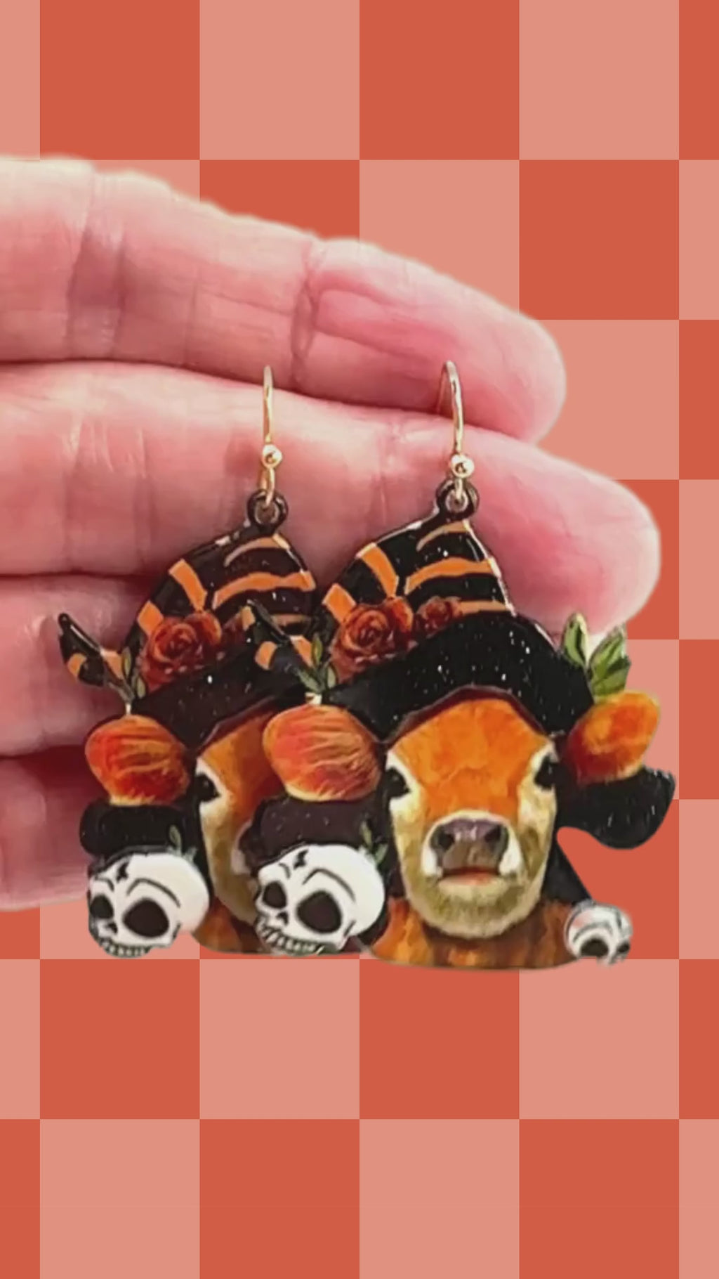 This cow is ready for Halloween with the striped witches hat and skulls. It is a light weight acrylic and hangs from a fish hook.