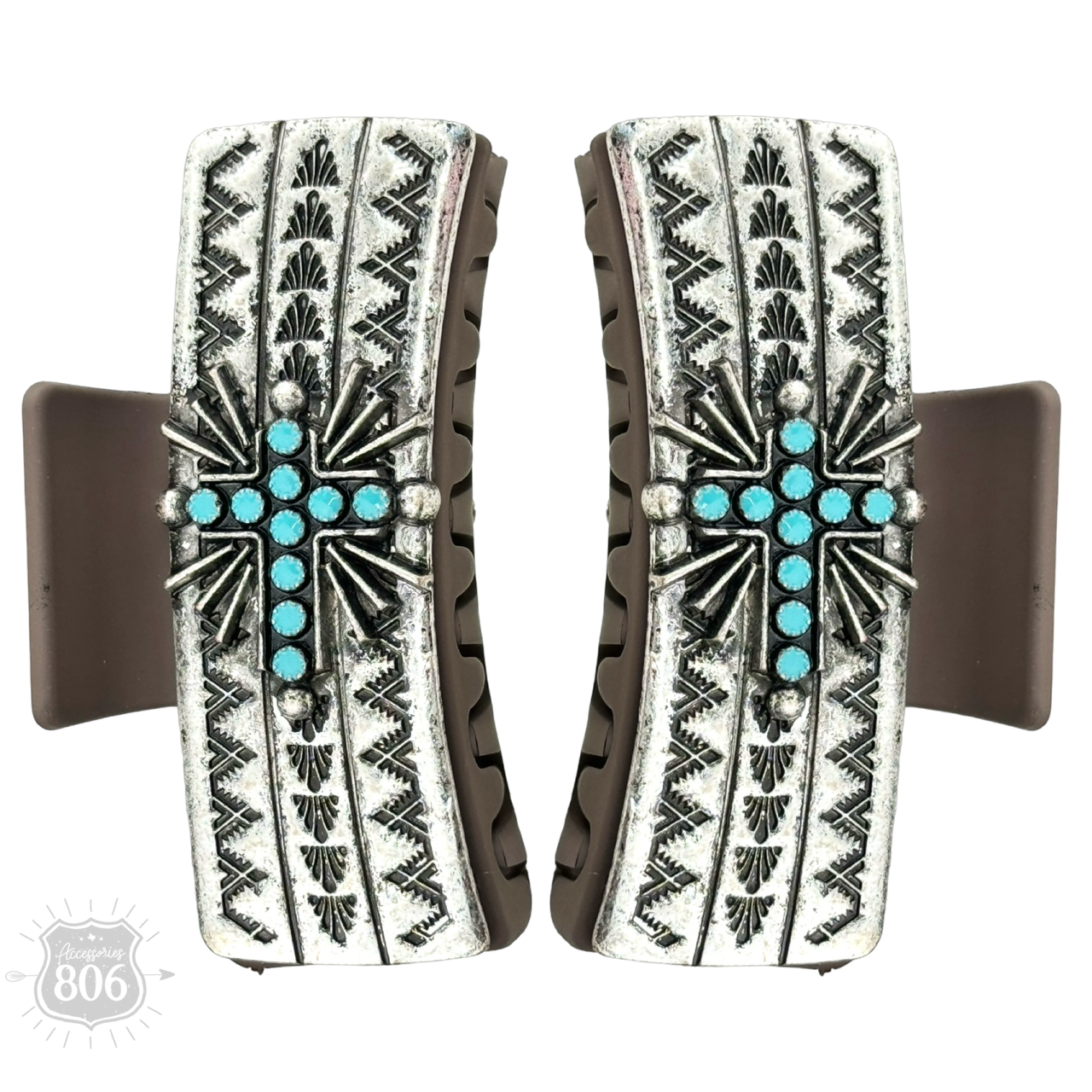 Western style claw hair clip with stamped silver tone metal and turquoise stone enamel cross on both sides.