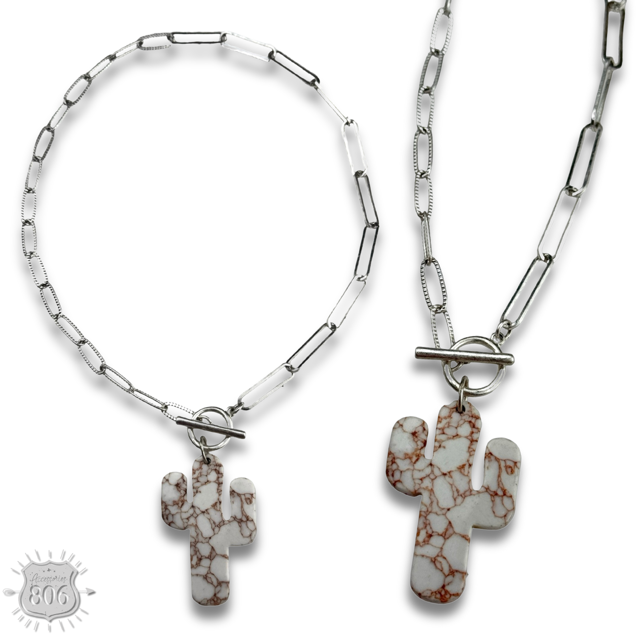 This western style silver toggle front chain necklace has a stone cactus pendant.