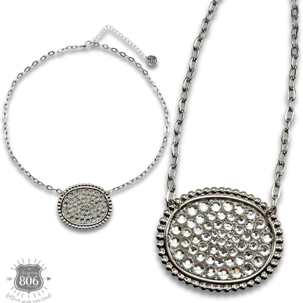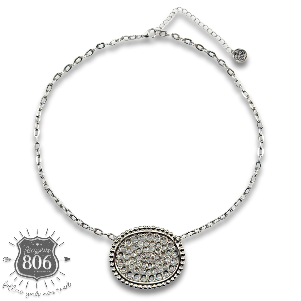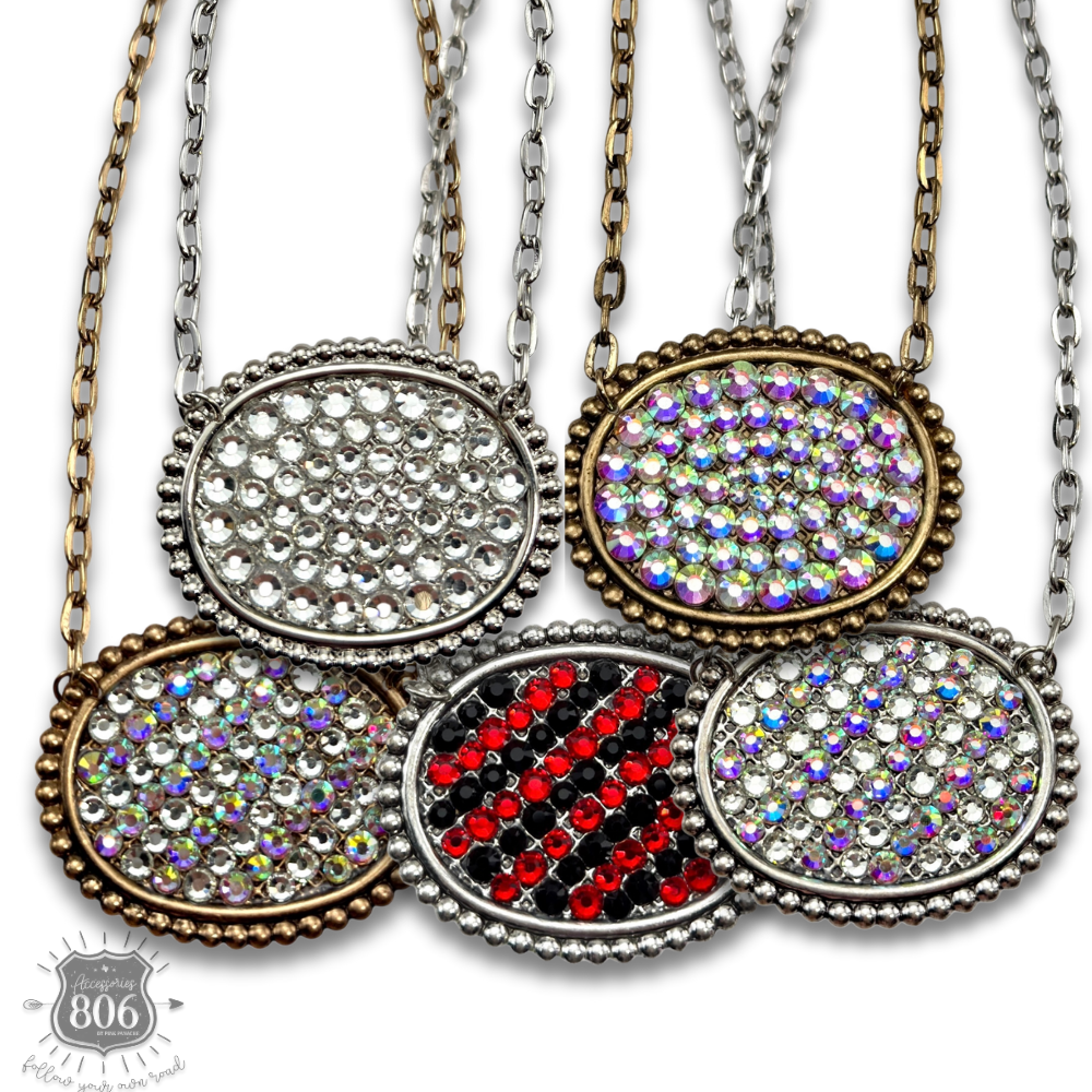 Elevate your everyday look with this stunning oval pendant, generously filled with sparkling rhinestones that catch the light from every angle. The medium-sized design strikes the perfect balance—bold enough to make a statement, yet versatile enough to layer or wear solo. Perfect for adding glamour to any outfit and sparkle to your jewelry collection.
