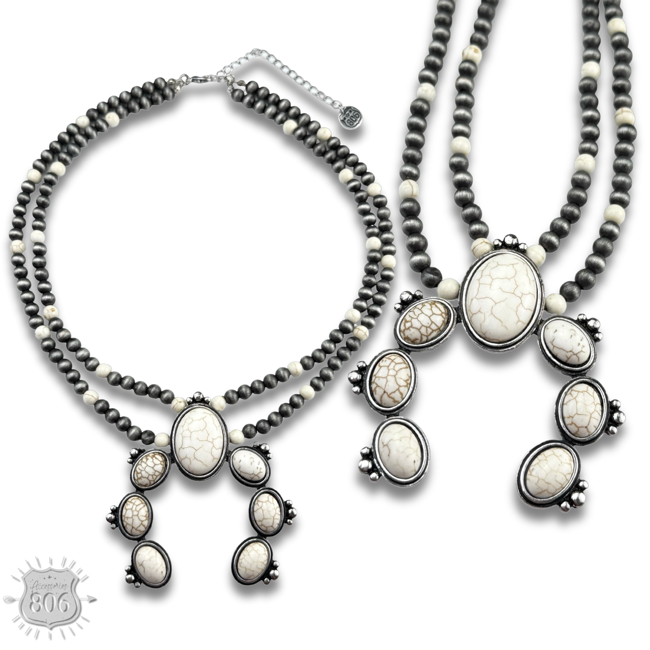 This large squash blossom pendant is on a double strand necklace of silver and stone beads.