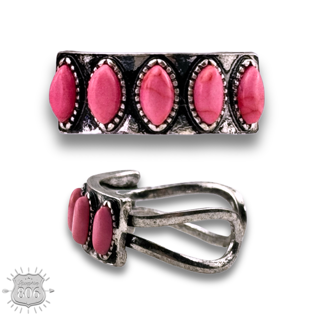 This ring is in the shape of a rectangle with inset pink stones and is adjustable.