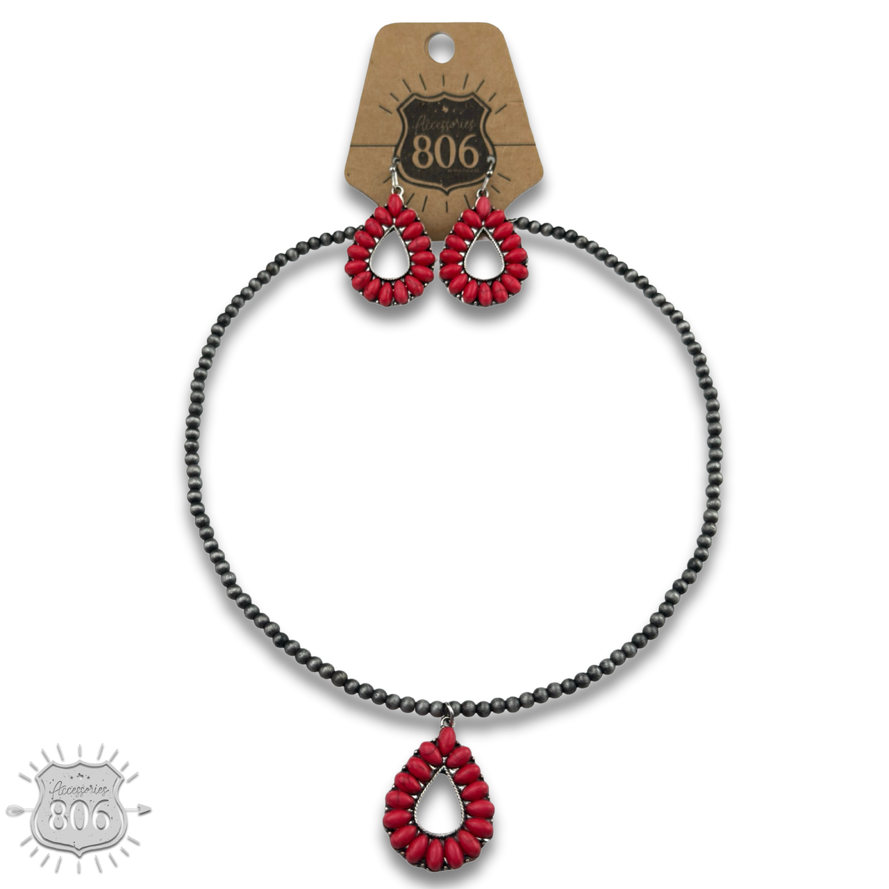 This set includes a burnished silver bead necklace with a stone teardrop pendant and a pair of matching stone teardrop earrings.
