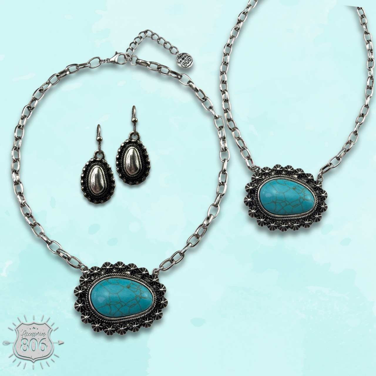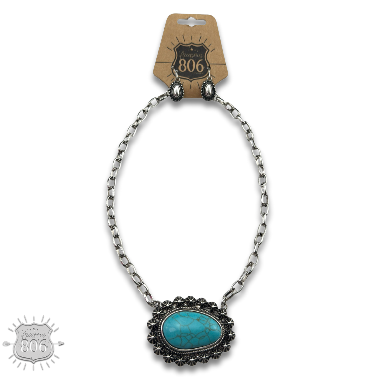 This set includes a chain link necklace with a decorative edge sideways turquoise color stone pendant.  The set comes with a pair of silver drop earrings.