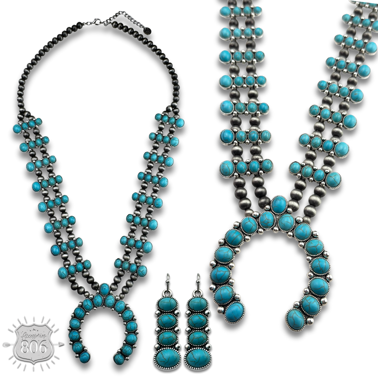 This set includes a turquoise color stone squash blossom necklace with burnished beads and a pair of coordinating earrings. The earrings have four turquoise color stones on a verticle bar.
