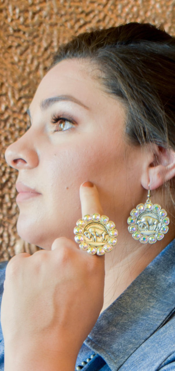This silver tone buffalo nickel earring is surrounded by high quality iridescent square rhinestones.