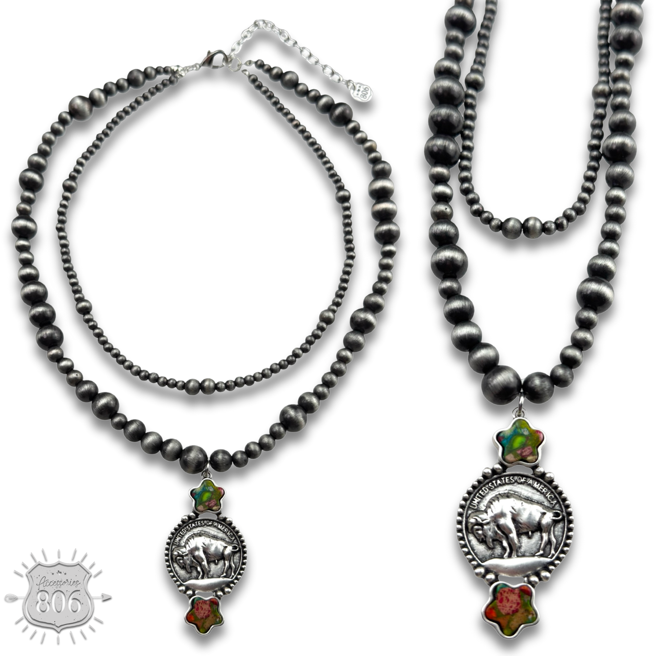 This two strand necklace features silver tone burnished beads with a buffalo nickel pendant inside a silver tone dotted setting with stone stars above and below it.
