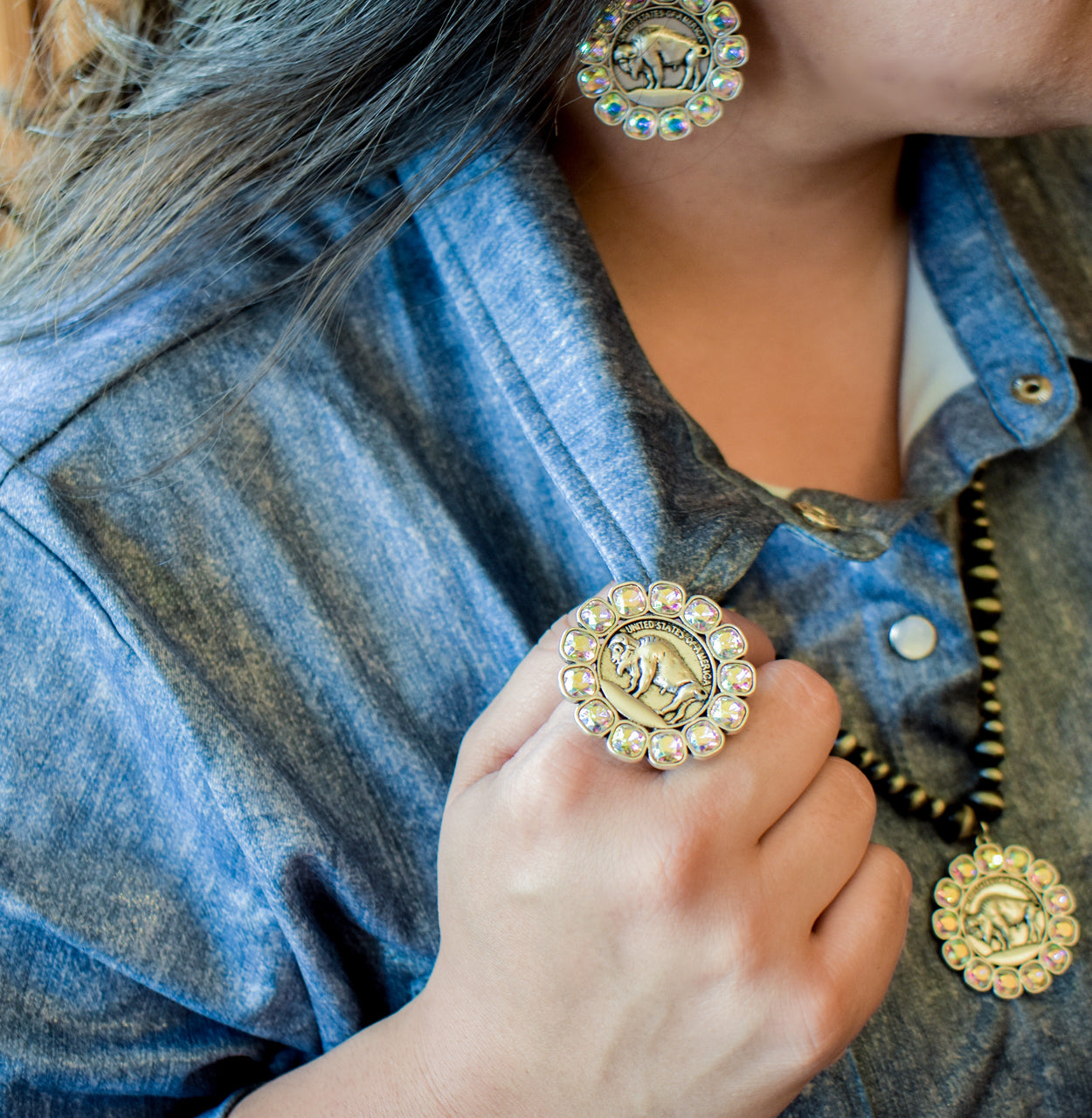 Buffalo nickel and rhinestone ring