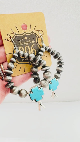 This burnished silver bead earring features different size round beads mixed with saucer beads. It has a square stone cross with blossom on french wire.