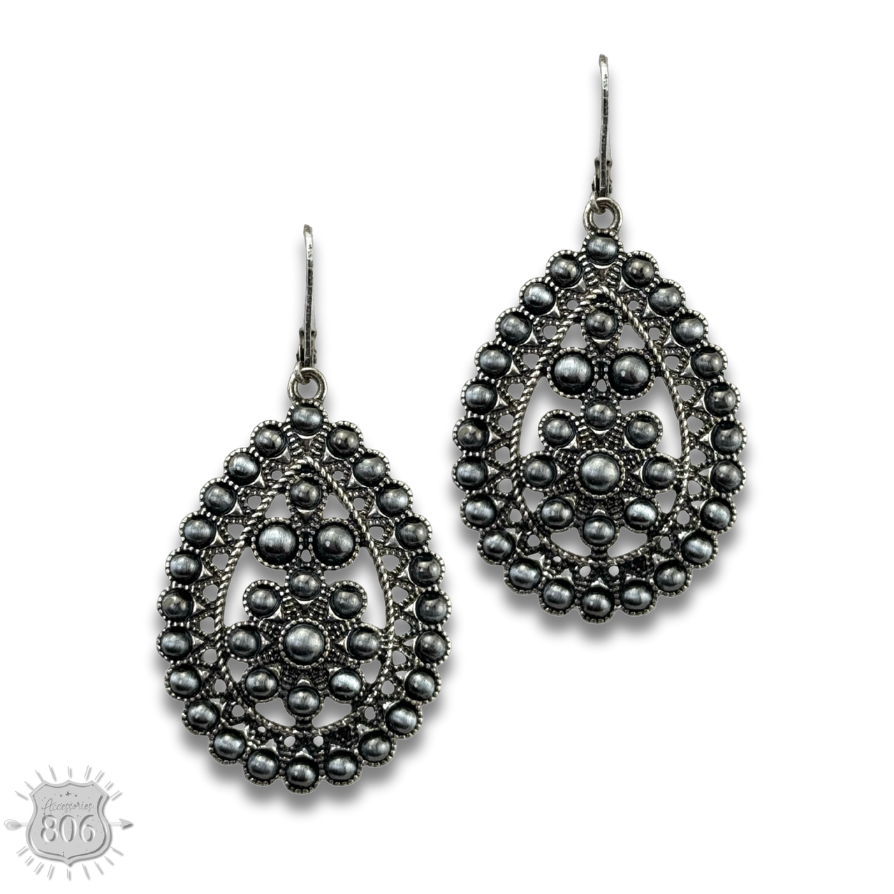 This burnished silver teardrop earring has an open diamond shape with bead studs around the rim on a french hook.  Approximately 2 inches in length.