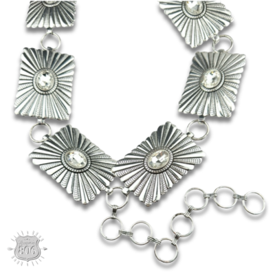 Elevate your western-inspired look with this striking belt featuring carved look rectangular conchos, each showcasing a dazzling clear oval rhinestone centerpiece. This versatile accessory instantly adds authentic western flair to any outfit.