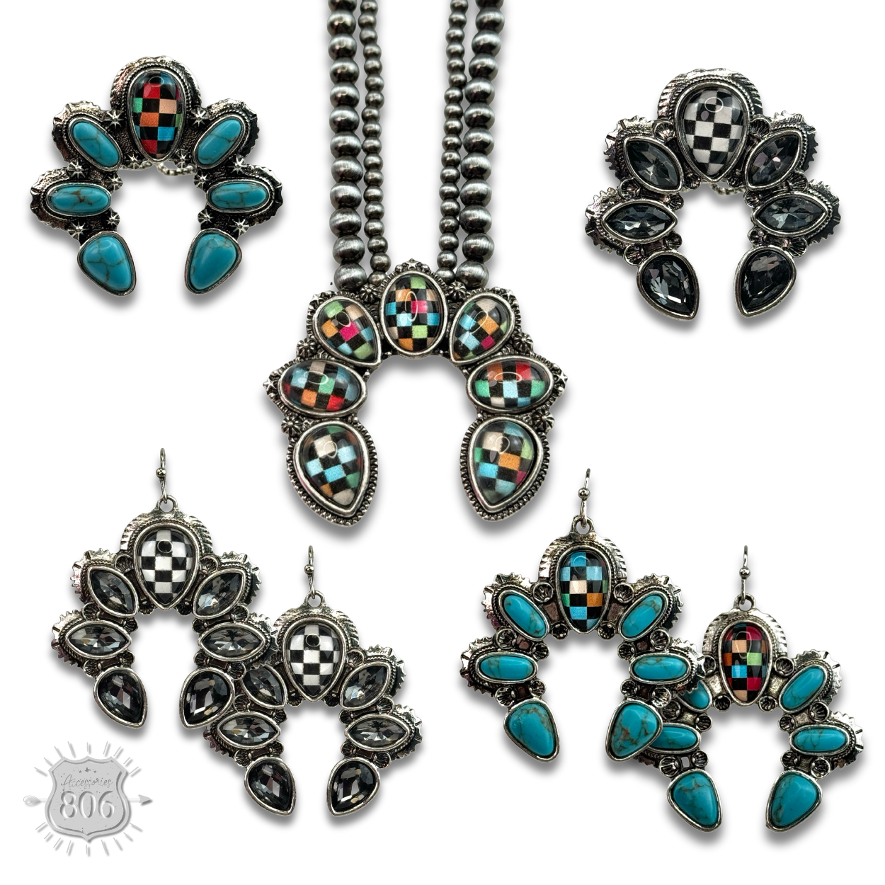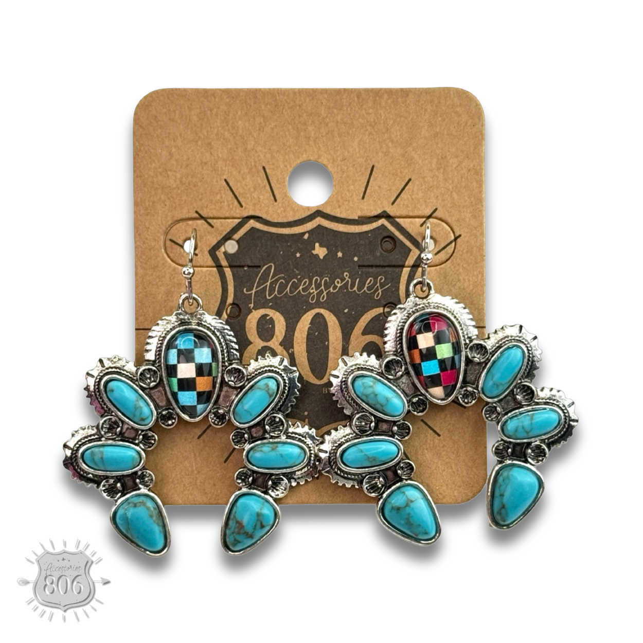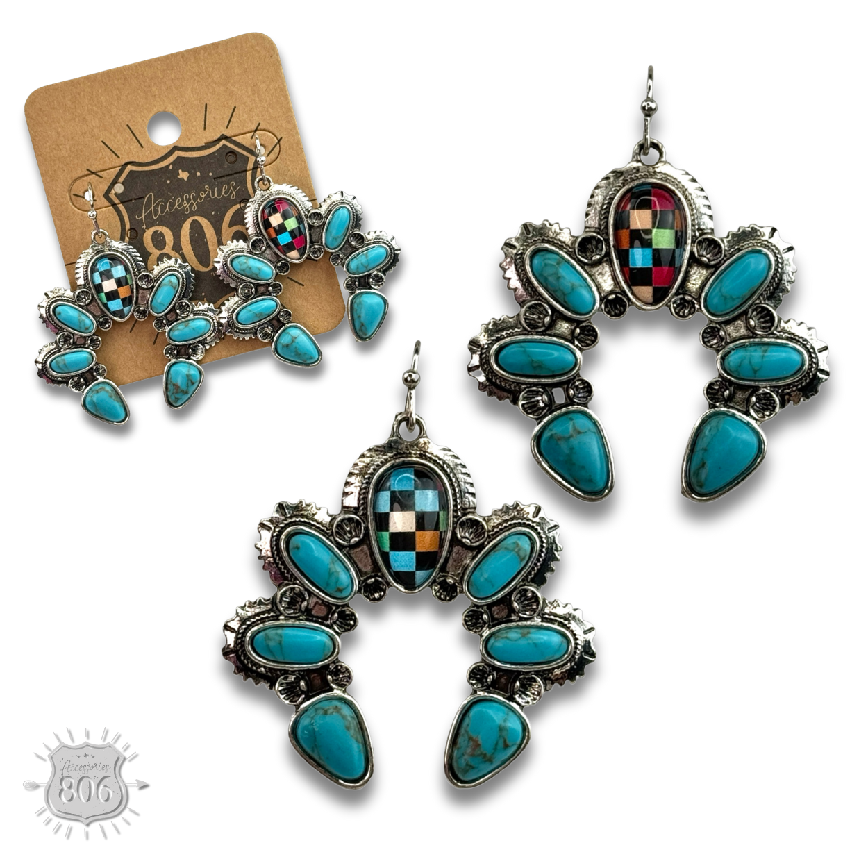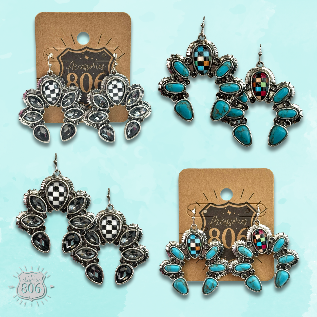 This earring features a naja shape with a checkerboard feature. It has either rhinestones or dyed stones set in.