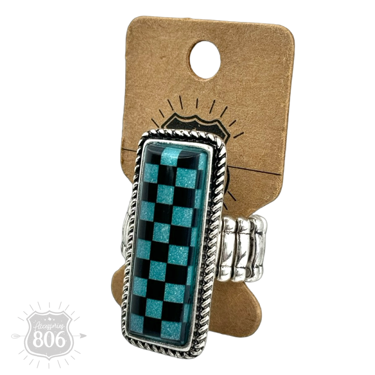 This silver tone ring has a checkerboard rectangle center. The ring stretches for ease of on and off.