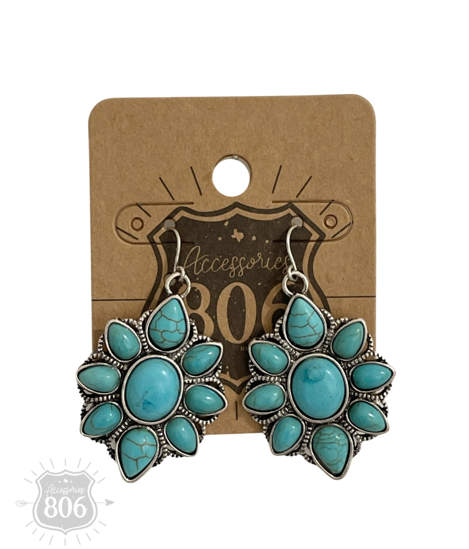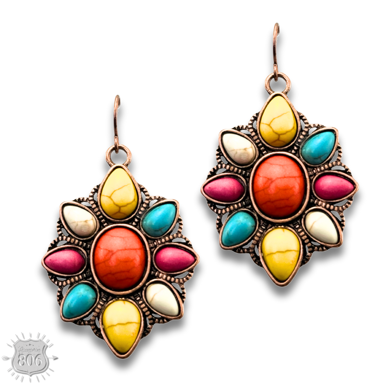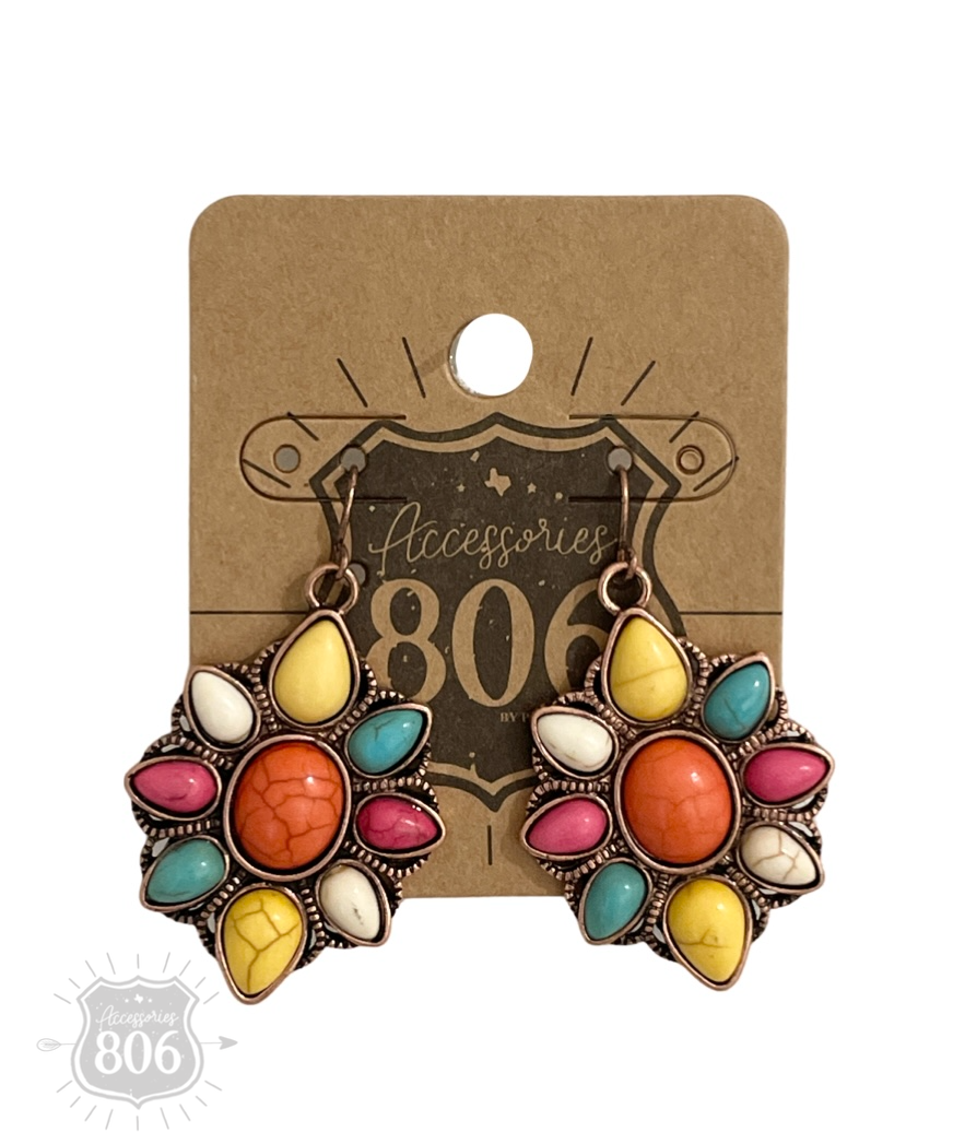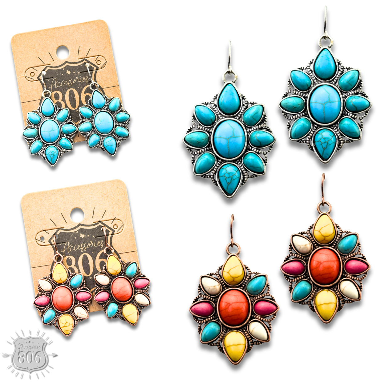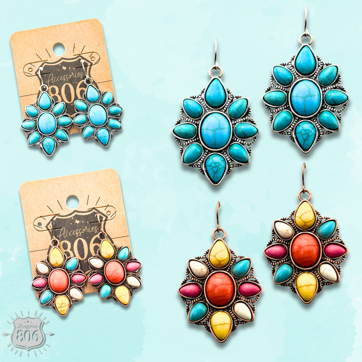 These earrings have stones of different shapes and sizes.  They hang from a french hook.