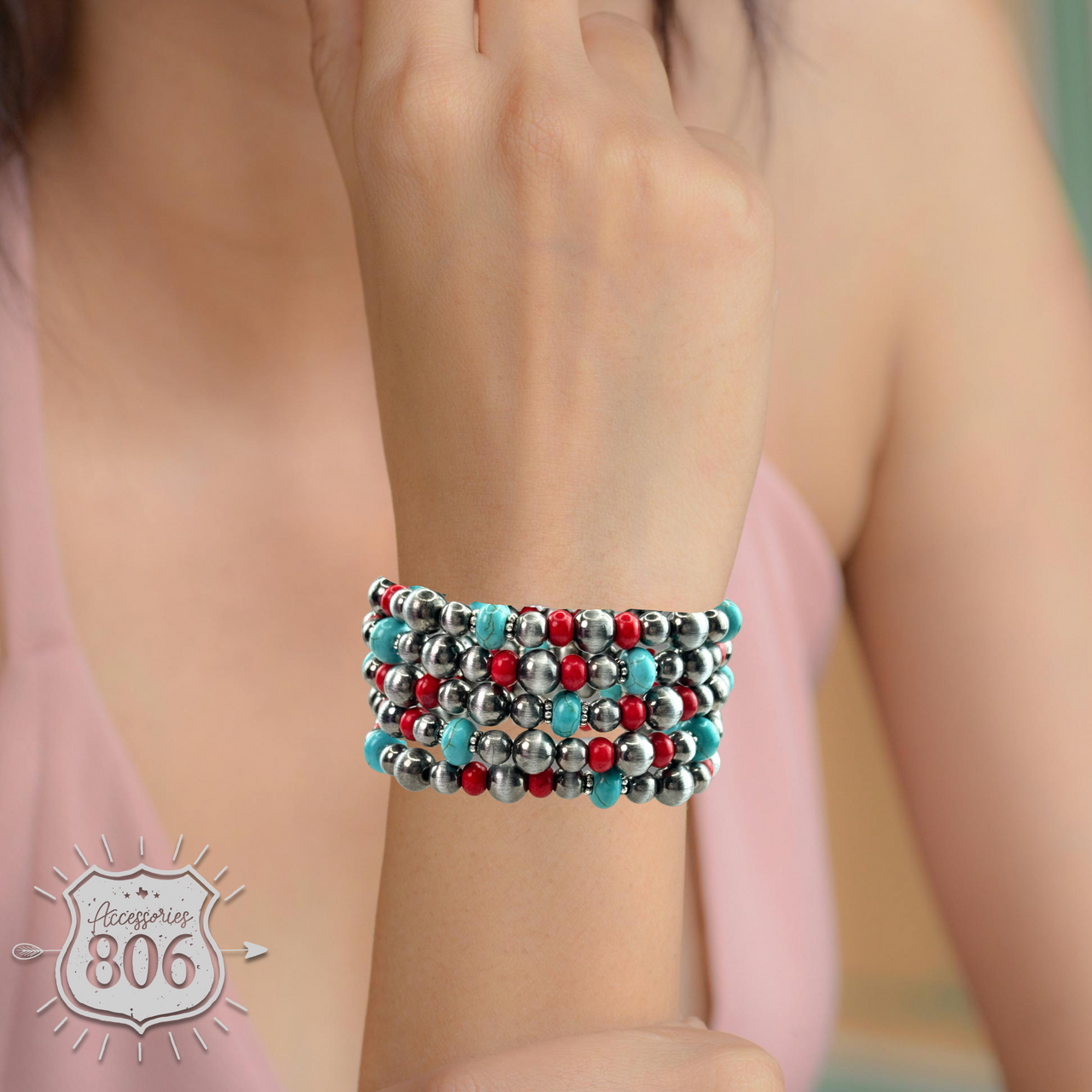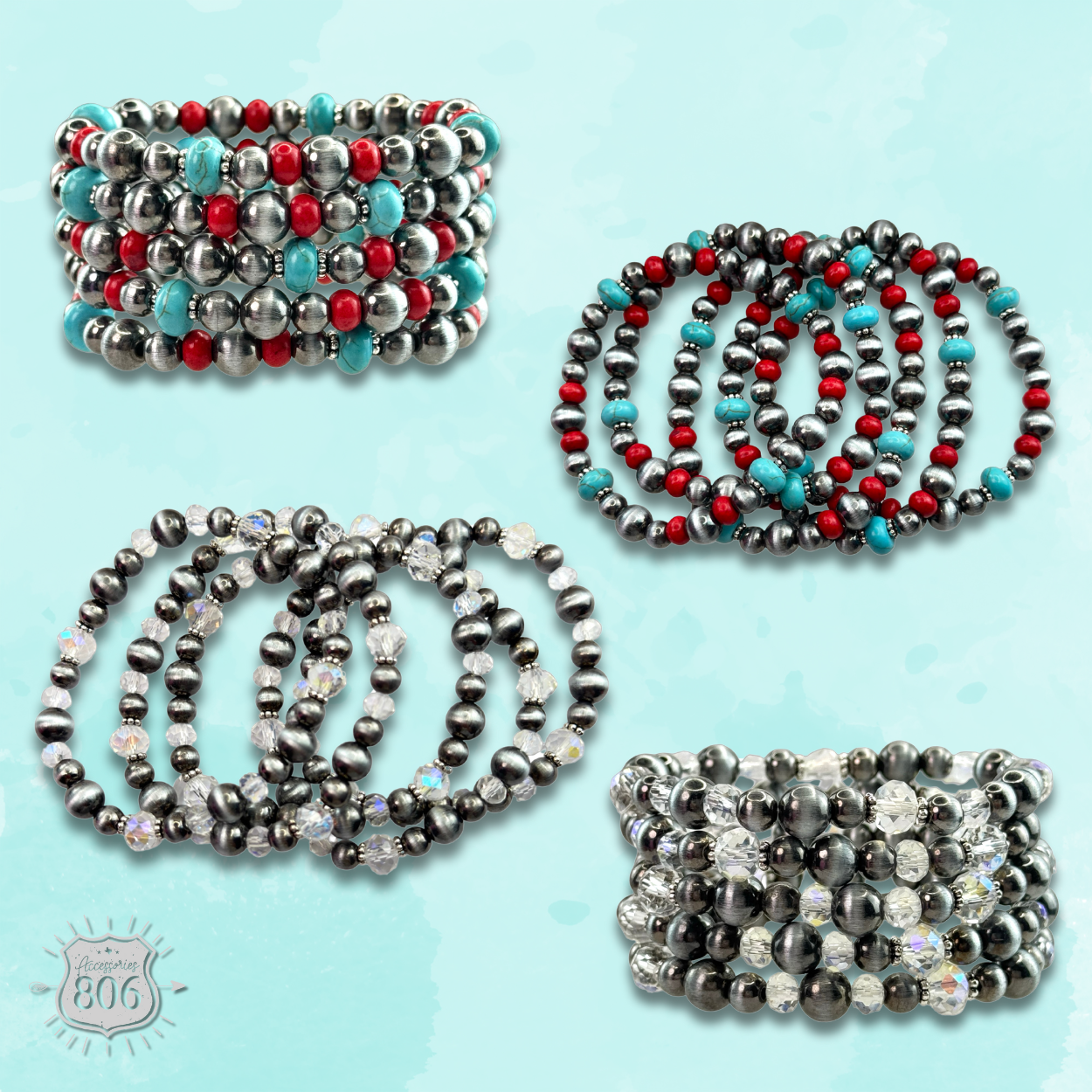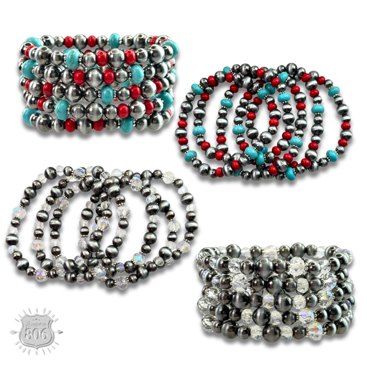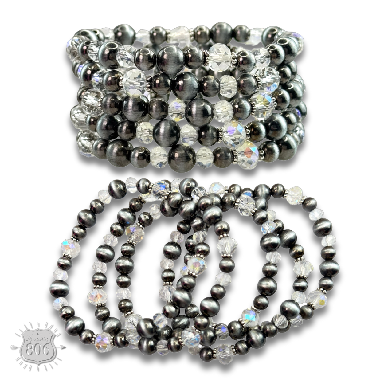 This five strand bracelet has a mix of burnished silver tone pearl beads with crystal or dyed stone beads. It stretches for ease of wear.