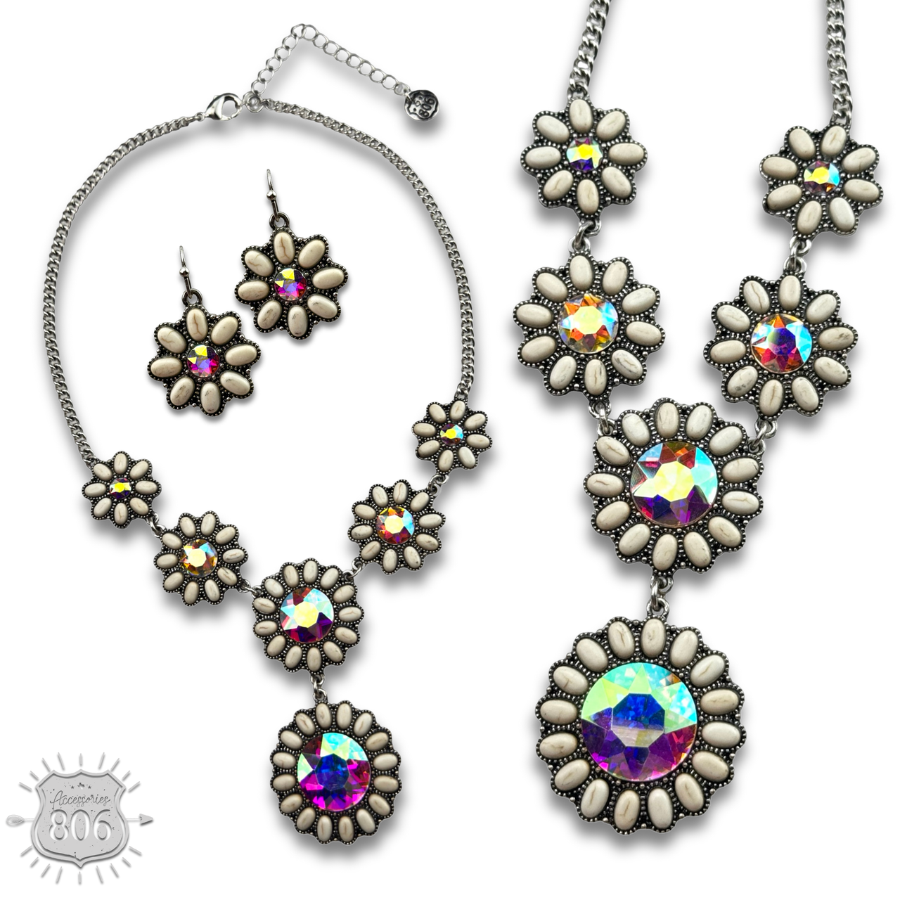 This necklace set has flower shaped conchos in stone with a large iridescent rhinestone center on silver chain. The earrings have the same stone colors and iridescent rhinestone.