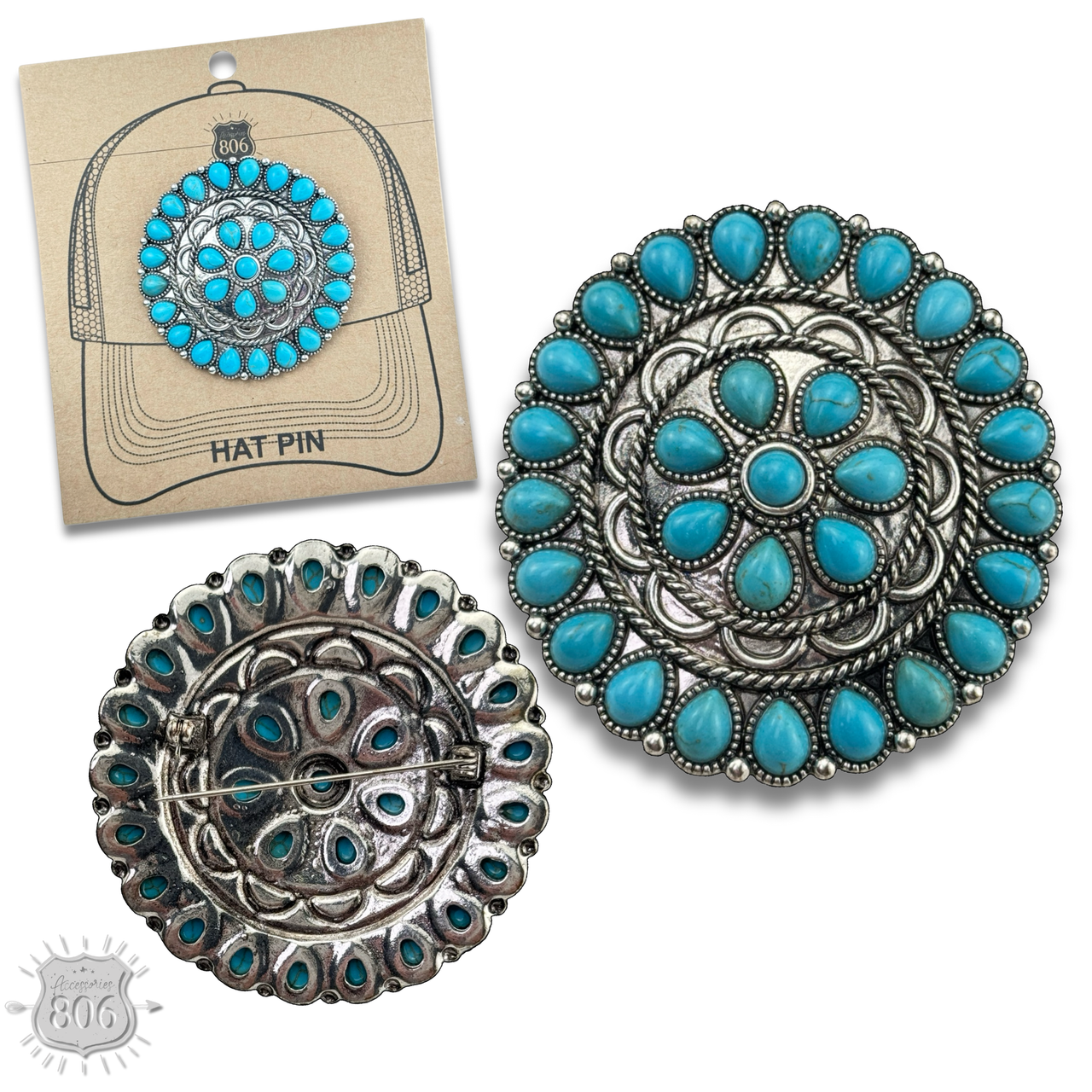 This round hat pin has turquoise color stones set in a silver tone setting. It has a traditional pin back. The pin is versatile as it can be used not only on hats or caps but on back packs, purses or anything you want to add a little extra bling to.