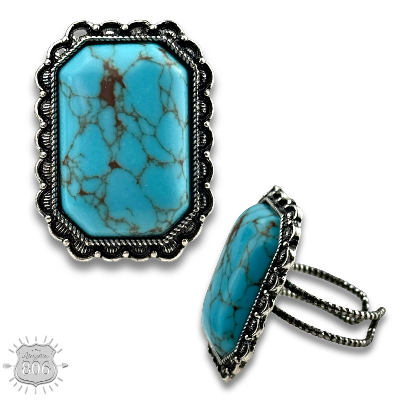 This ring has a large octagon shaped turquoise color stone surrounded in scalloped silver tone on an adjustable base.