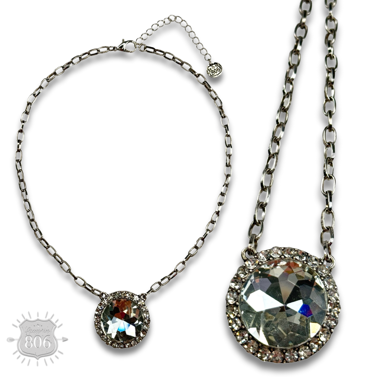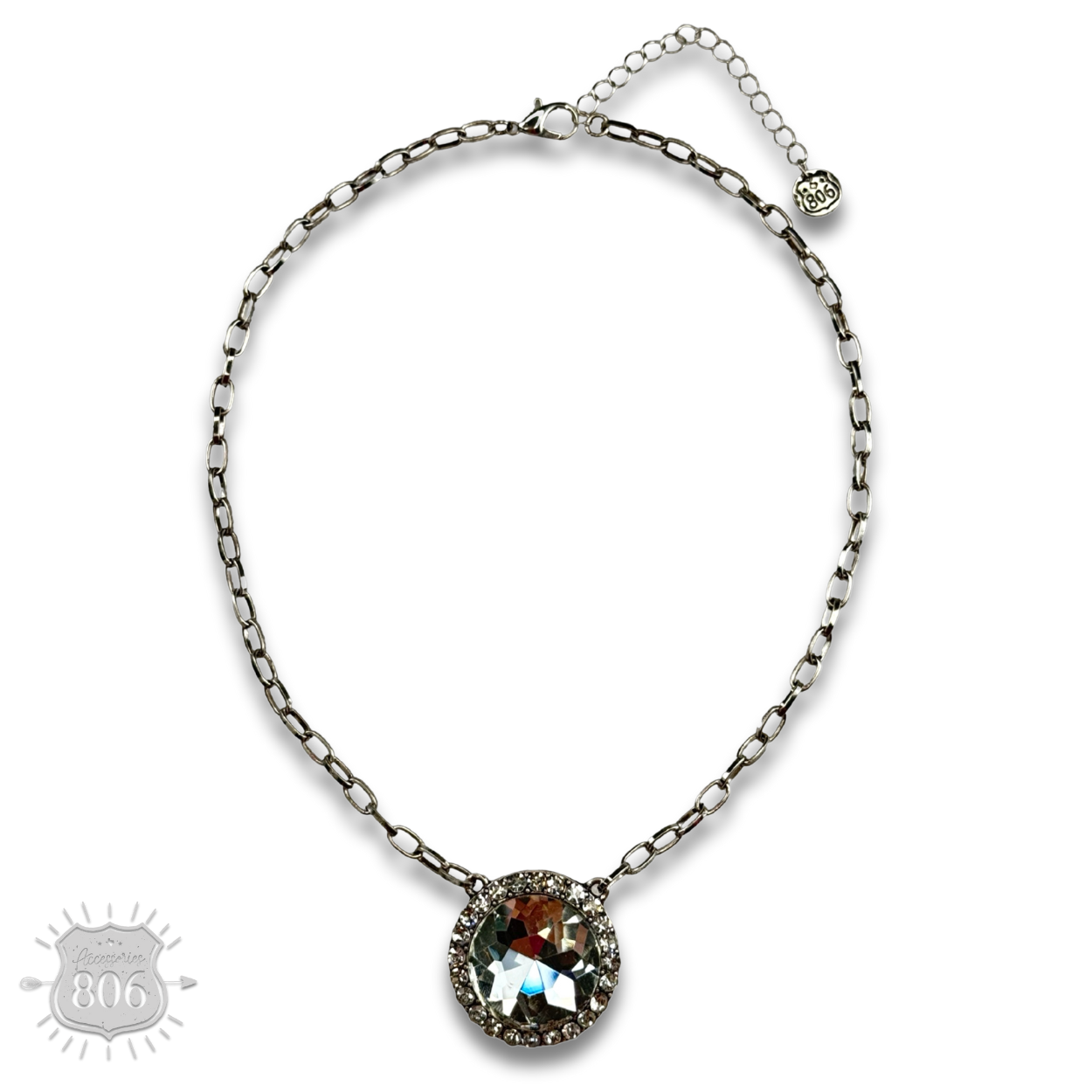 This necklace has a large round pendant. Small round rhinestones highlight the center feature. It hangs from a silver tone link chain necklace.