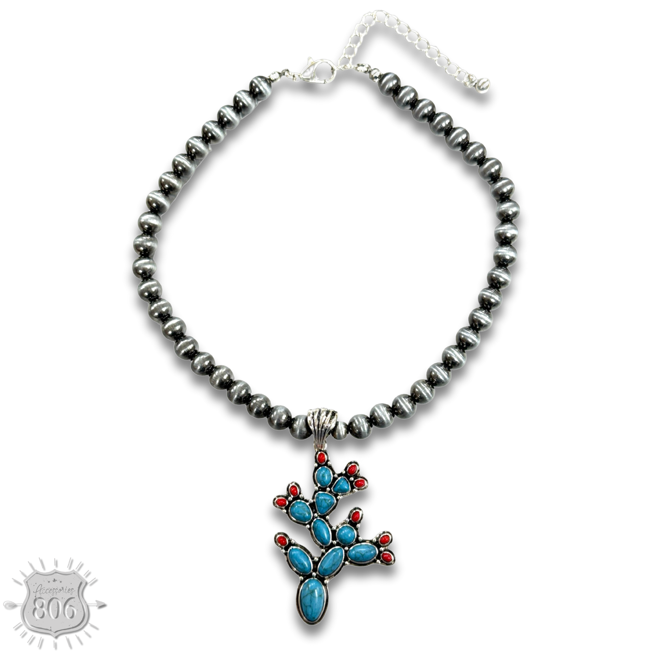 This necklace has burnished silver tone beads and a turquoise color stone prickly pear cactus pendant. Necklace is approximately 16" in length with extender chain.