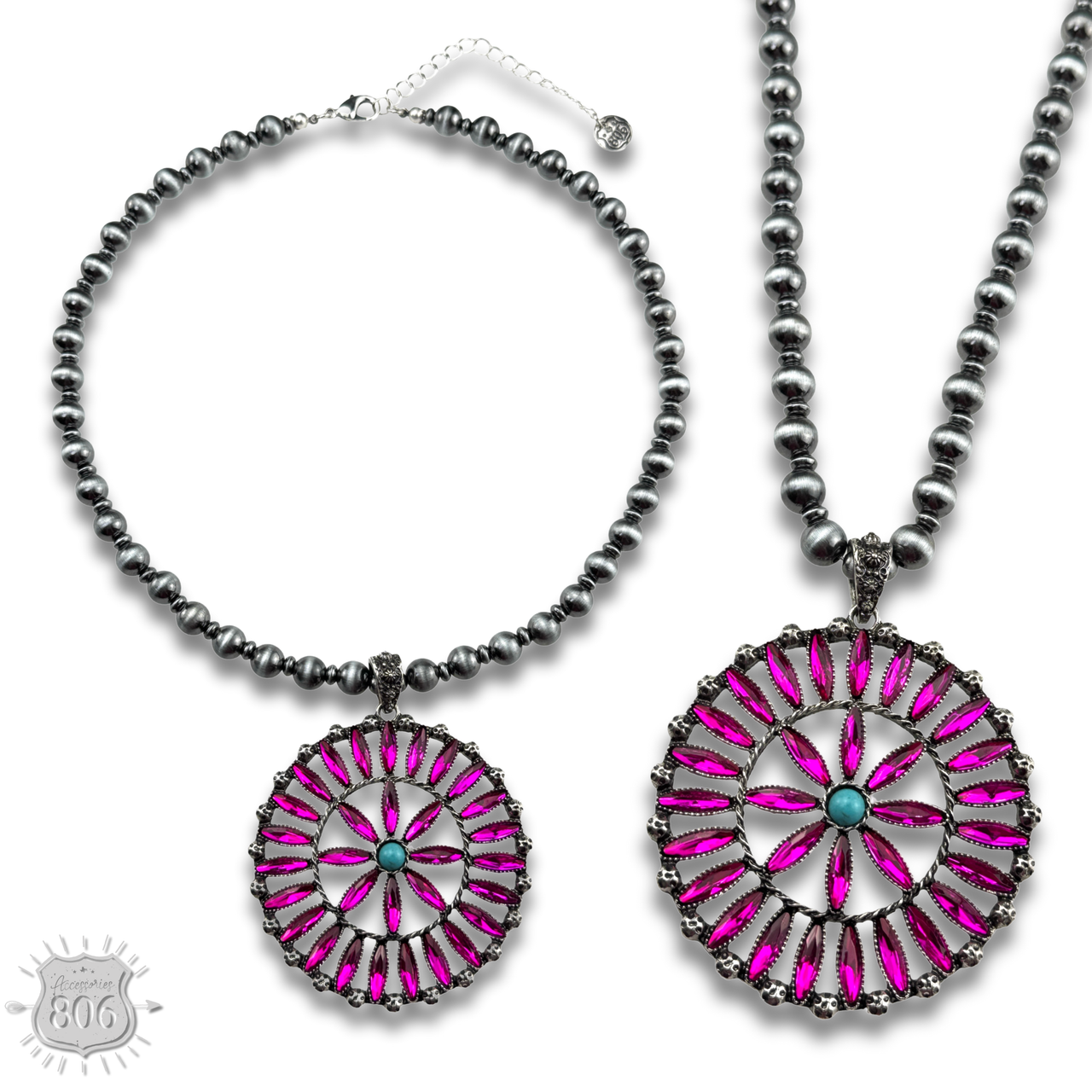This western style necklace has burnished silver beads with a large round southwest flower shape rhinestone pendant with center turquoise bead.